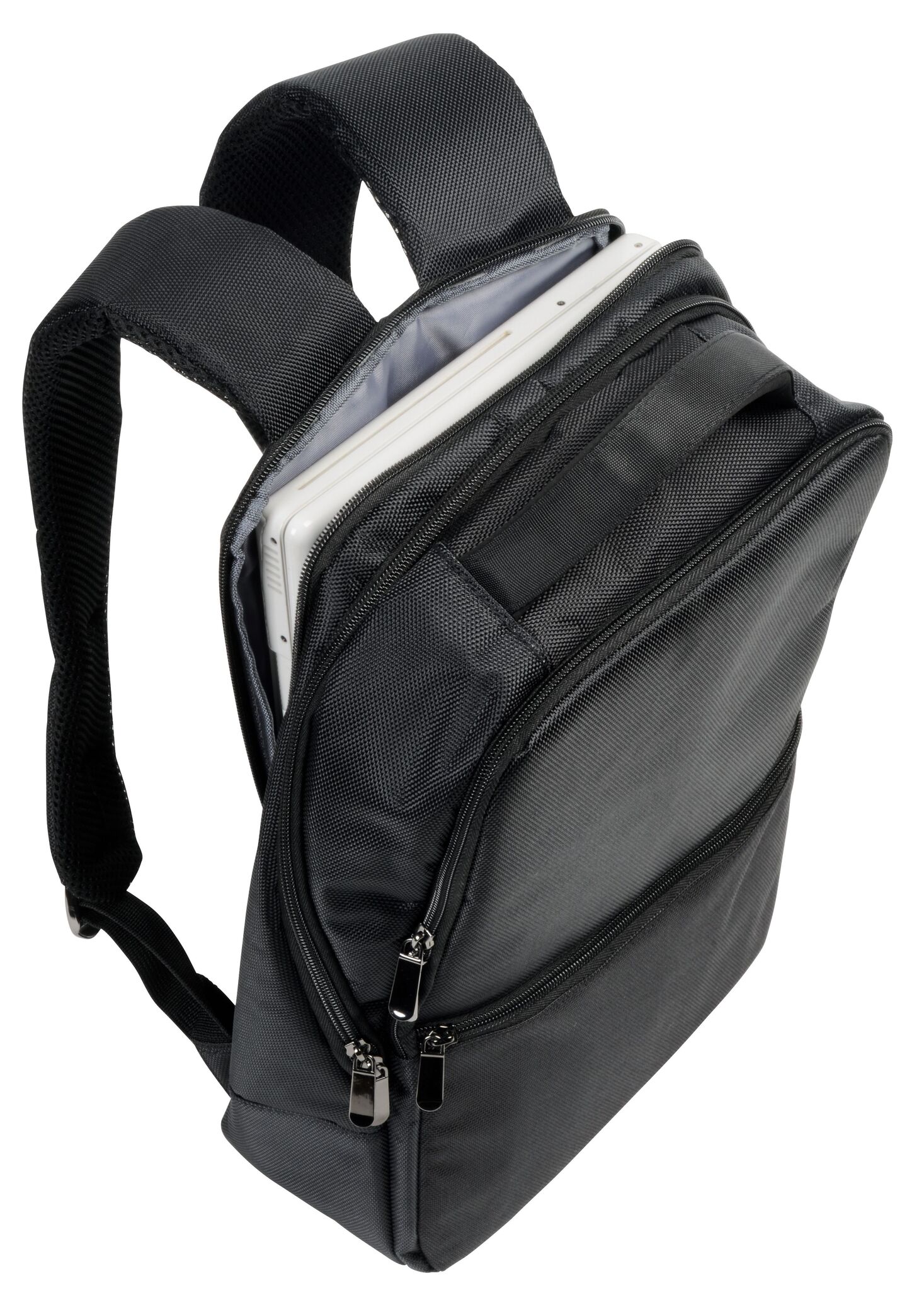 Рюкзак OXFORD : 1 небольшой передний карман на молнии, 1 передний отдел с небольшим органайзером, 1 главный отдел на молнии и 2 уплотненных кармашка для мультимедийных приборов, 1 сетчатый карман на молнии, 1 уплотненное отделение для ноутбука, уплотненные эргономичные ремни, уплотненная спинка с возможномтью крепления к ручке чемодана.