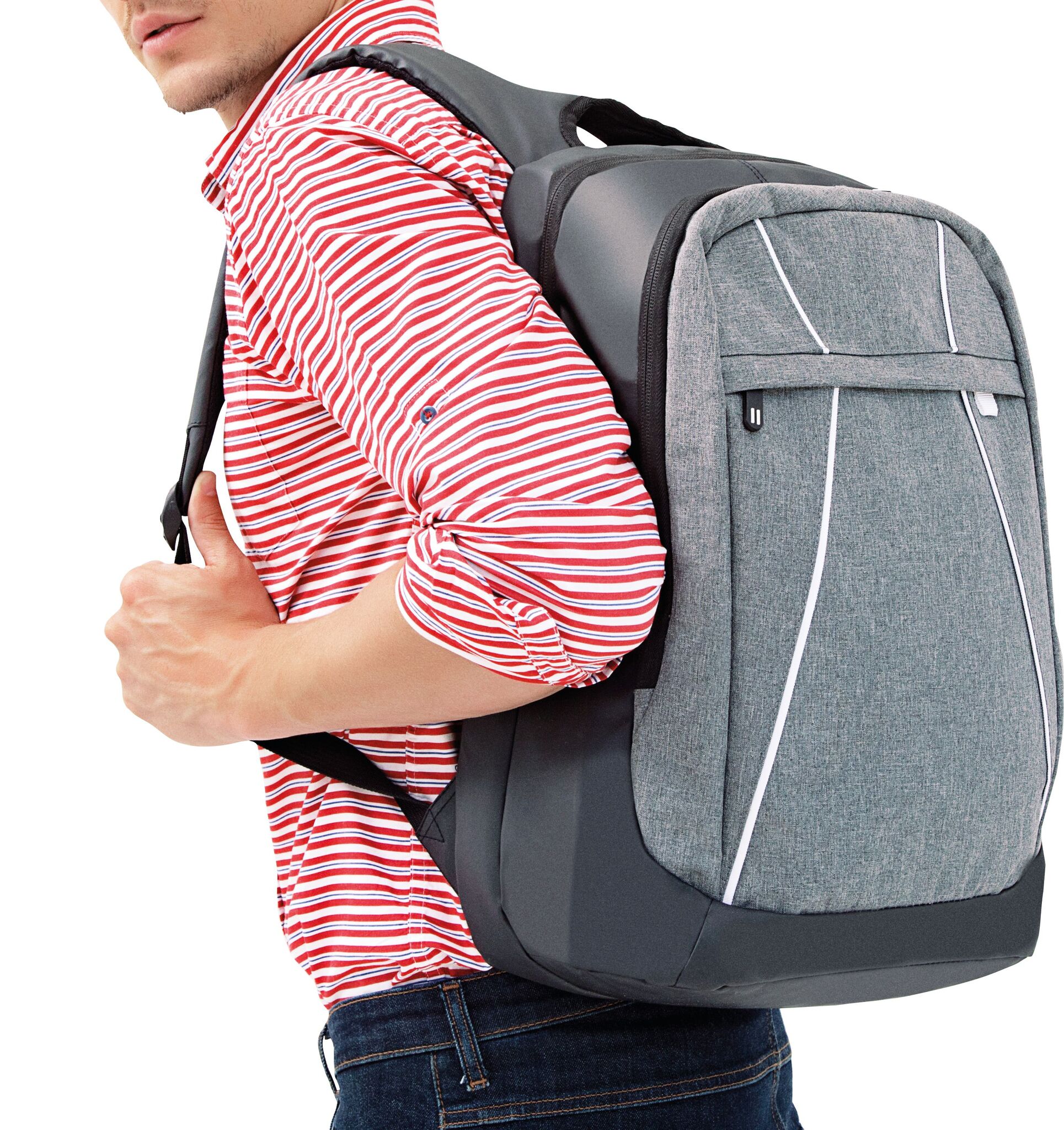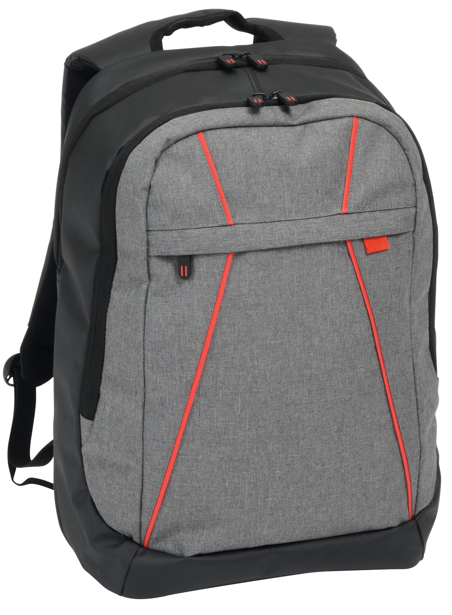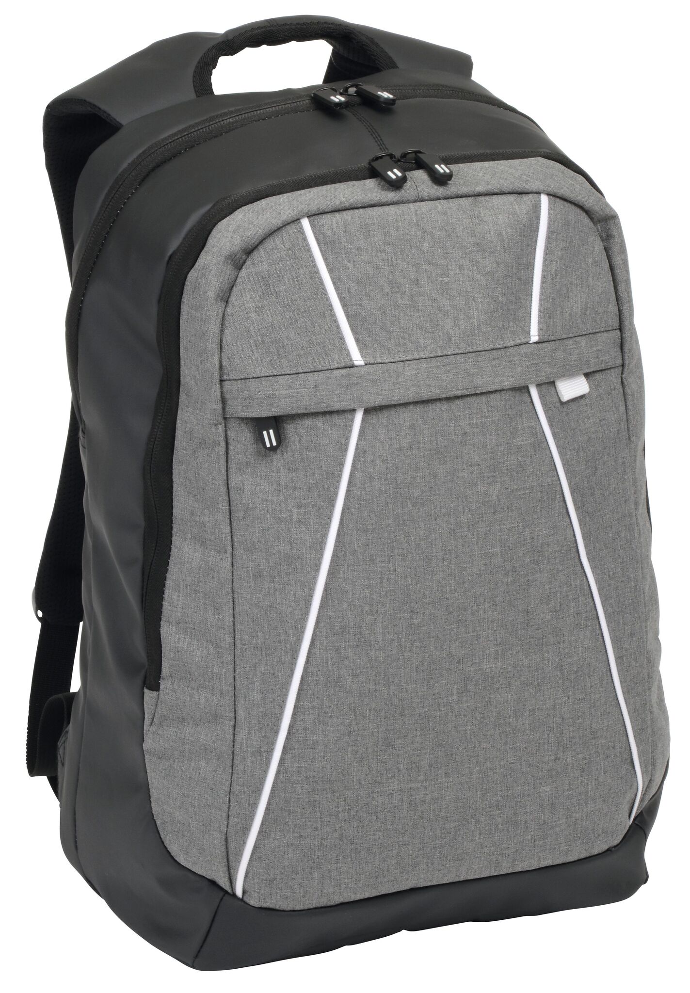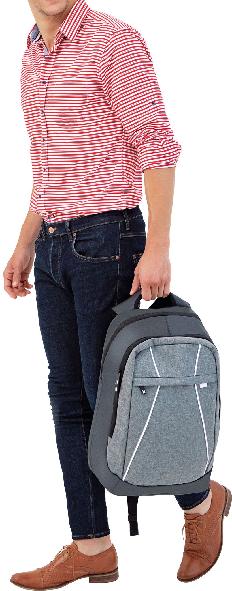 Рюкзак SPLIT : 1 наружный карман на молнии, 2 главных отдела на молнии, один главный отдел с уплотненным карманом для ноутбука и 1 вставным карманом, другой главный отдел с маленьким органайзером, переносная ручка, уплотненные наплечные лямки и спинка