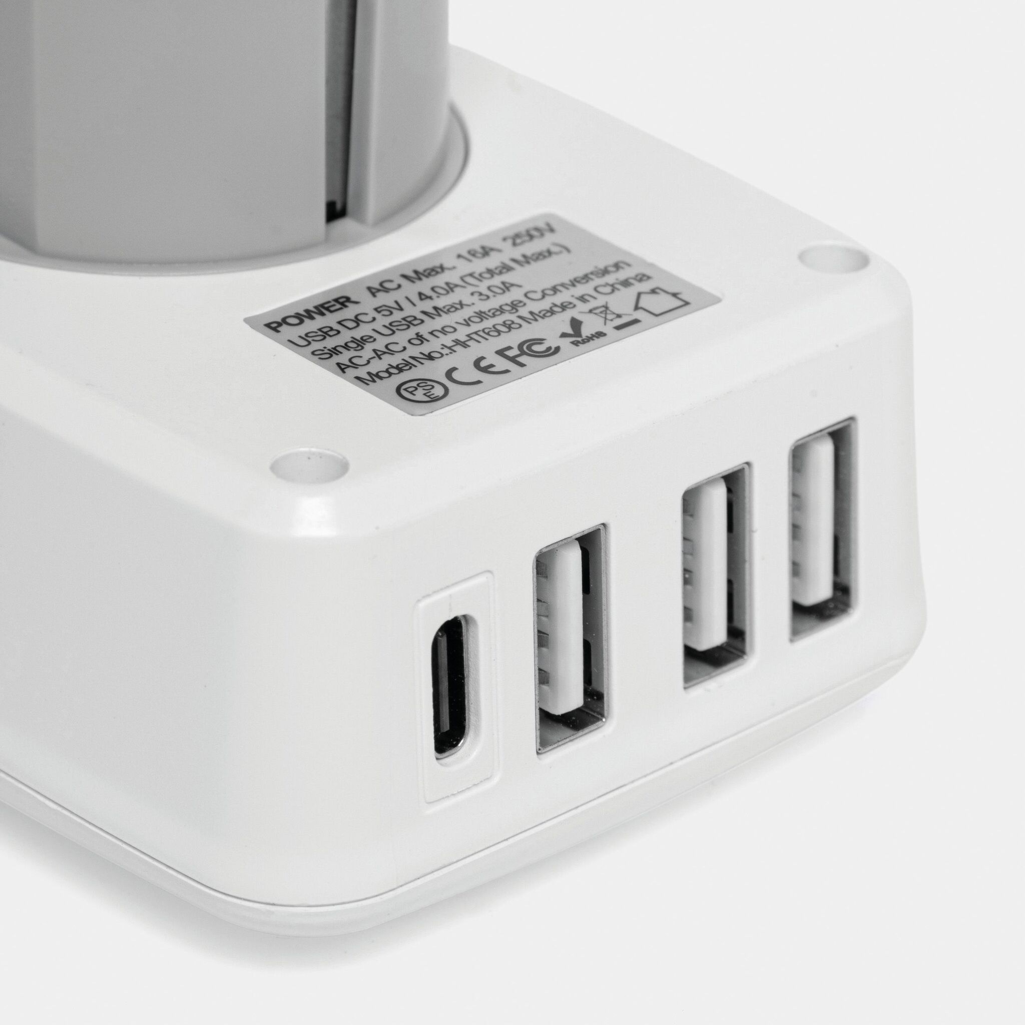 Штекер зарядного устройства с USB-адаптером ENDLESS POWER PRO : 1 заземленная розетка с защищёнными контактами и защитой от детей, 3 порта USB-A, 1 порт USB-C, выход USB: макс. 3 A, выход с защищёнными контактами макс. 4000 Вт, синий светодиодный индикатор состояния, не для использования в Великобритании