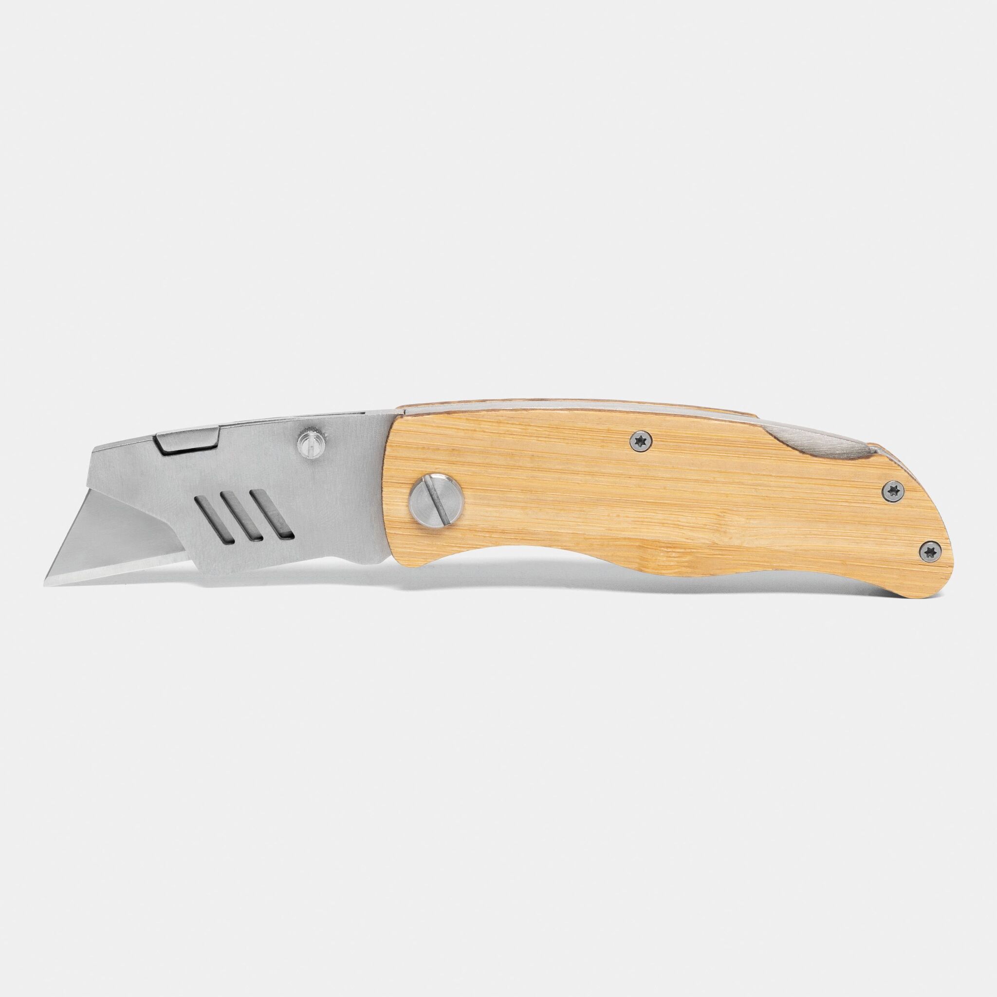 Складной обивочный нож ECO CUT : со сменным лезвием, пять запасных лезвий в комплекте, эргономичная форма рукояти в бамбуковой рамке, клипса на пояс