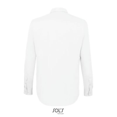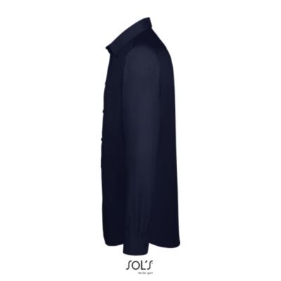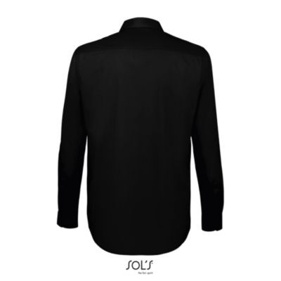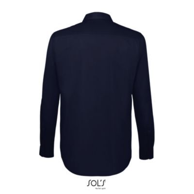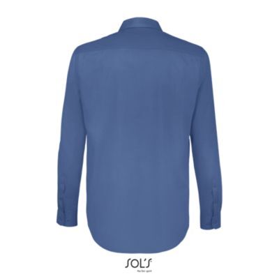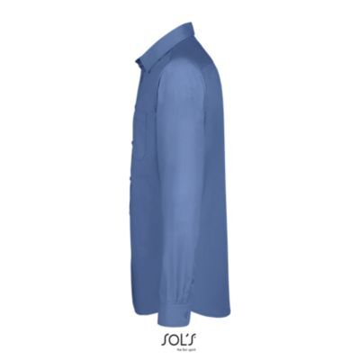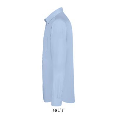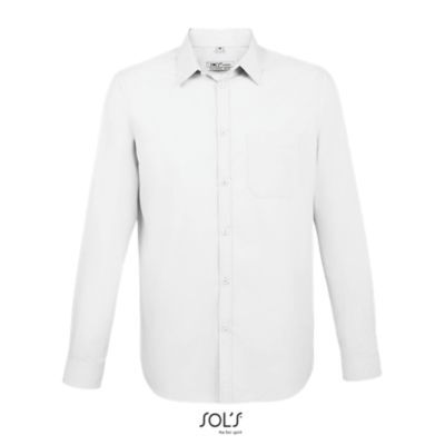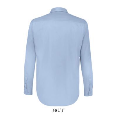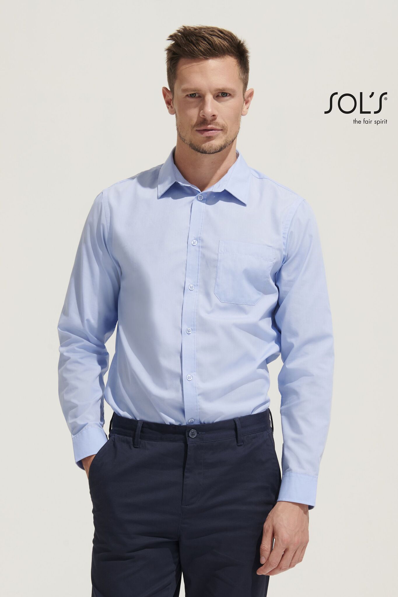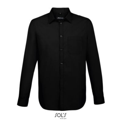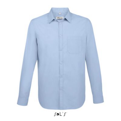 РУБАШКА МУЖСКАЯ ИЗ ПОПЛИНА С ДЛИННЫМ РУКАВОМ. Полуприлегающий крой; Длинный рукав; Классический жесткий воротник; Регулируемые манжеты на 2 пуговицах и разрез рукава "капуцин"; Планка с 7 пуговицами в цвет изделия; Съемные косточки в воротнике; Нагрудный карман слева