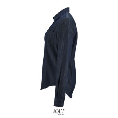 ЖЕНСКАЯ РУБАШКА ИЗ ДЕНИМА. Приталенная модель; Длинный рукав; Классический воротник; Скругленные манжеты на 1 пуговице; Планка с 7 пуговицами; Застегивающийся на пуговицу разрез рукава "капуцин"; Вытачки на груди и спине; Деним Brut; 1 нагрудный карман; Стирать с изделиями такой же цветовой гаммы; Постирать перед первым использованием