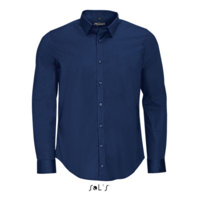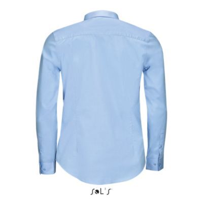 РУБАШКА МУЖСКАЯ ИЗ ТКАНИ СТРЕТЧ С ДЛИННЫМ РУКАВОМ. Зауженный крой; Длинный рукав; Современный классический воротник; Манжеты на 2 пуговицах и разрез рукава "капуцин"; Планка с 8 пуговицами в цвет изделия; 2 вытачки на уровне пояса на спине