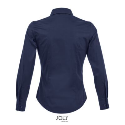 РУБАШКА ЖЕНСКАЯ ИЗ ТКАНИ СТРЕЙЧ С ДЛИННЫМ РУКАВОМ. Приталенная модель; Длинный рукав; Воротник на одной пуговице; Регулируемые манжеты на 2 пуговицах и разрез рукава "капуцин"; Планка с 7 пуговицами в цвет изделия; Вытачки спереди и на спине