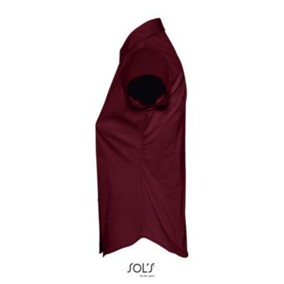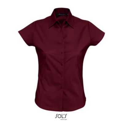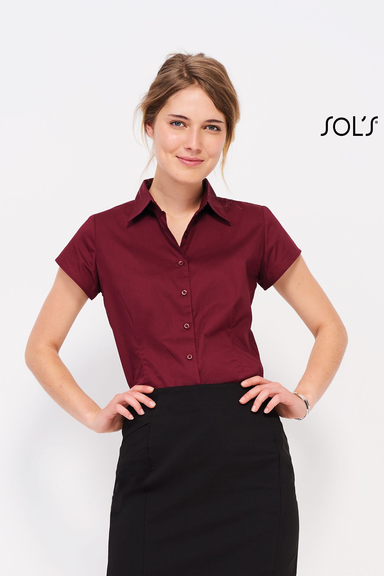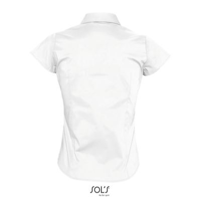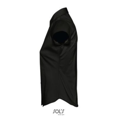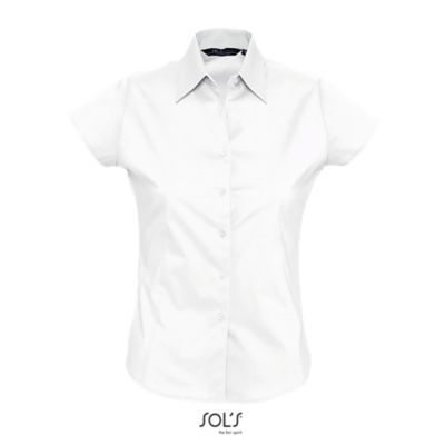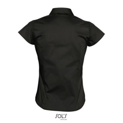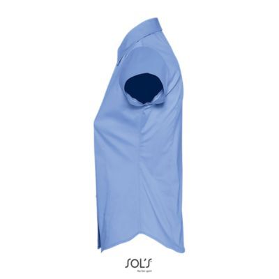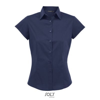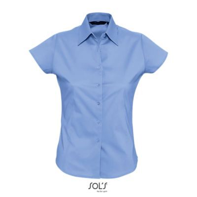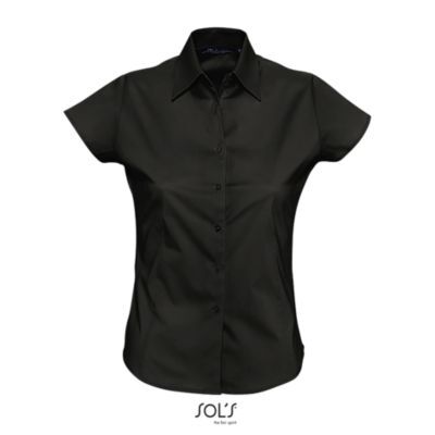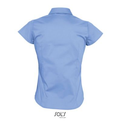 РУБАШКА ЖЕНСКАЯ ИЗ ТКАНИ СТРЕЙЧ С КОРОТКИМ РУКАВОМ. Приталенная модель; Короткий рукав; Воротник на одной пуговице; Планка с 7 пуговицами в цвет изделия; Вытачки спереди и на спине