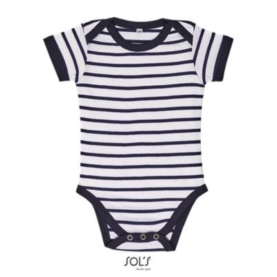 БОДИ ДЛЯ РЕБЕНКА В ПОЛОСКУ. Прошивка по вороту; Воротник-конверт; Контрастная отделка; Застегивается на кнопку возле ластовицы
