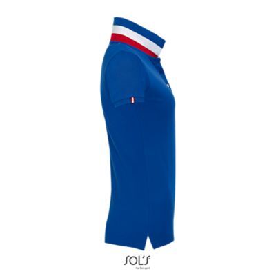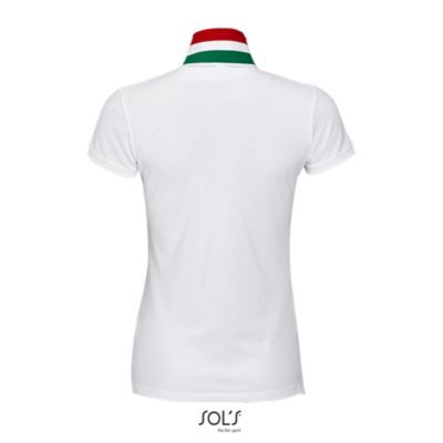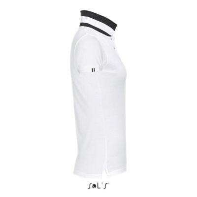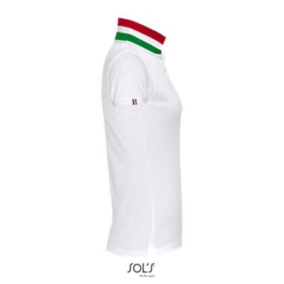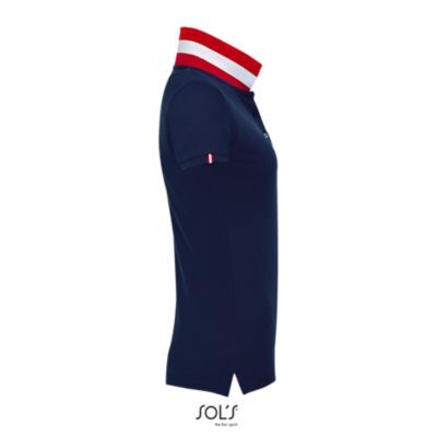 ЖЕНСКАЯ РУБАШКА ПОЛО. Ребристый воротник и манжеты; Полоса чистоты у воротника; Короткие рукава; Полосатый под воротником; Усиленный воротник с 3 жемчужно-белыми пуговицами; Тонкая двухцветная полоска на вырезе горловины + пуговичная застежка + боковые разрезы + нижняя метка на рукавах; Сшитый разрез; Зауженный крой; Запасная пуговица на внутреннем боковом шве