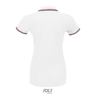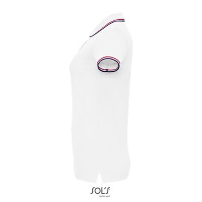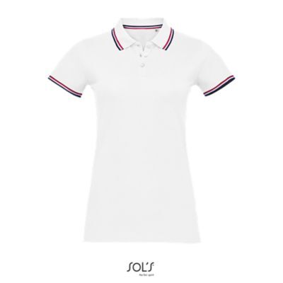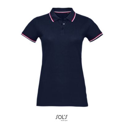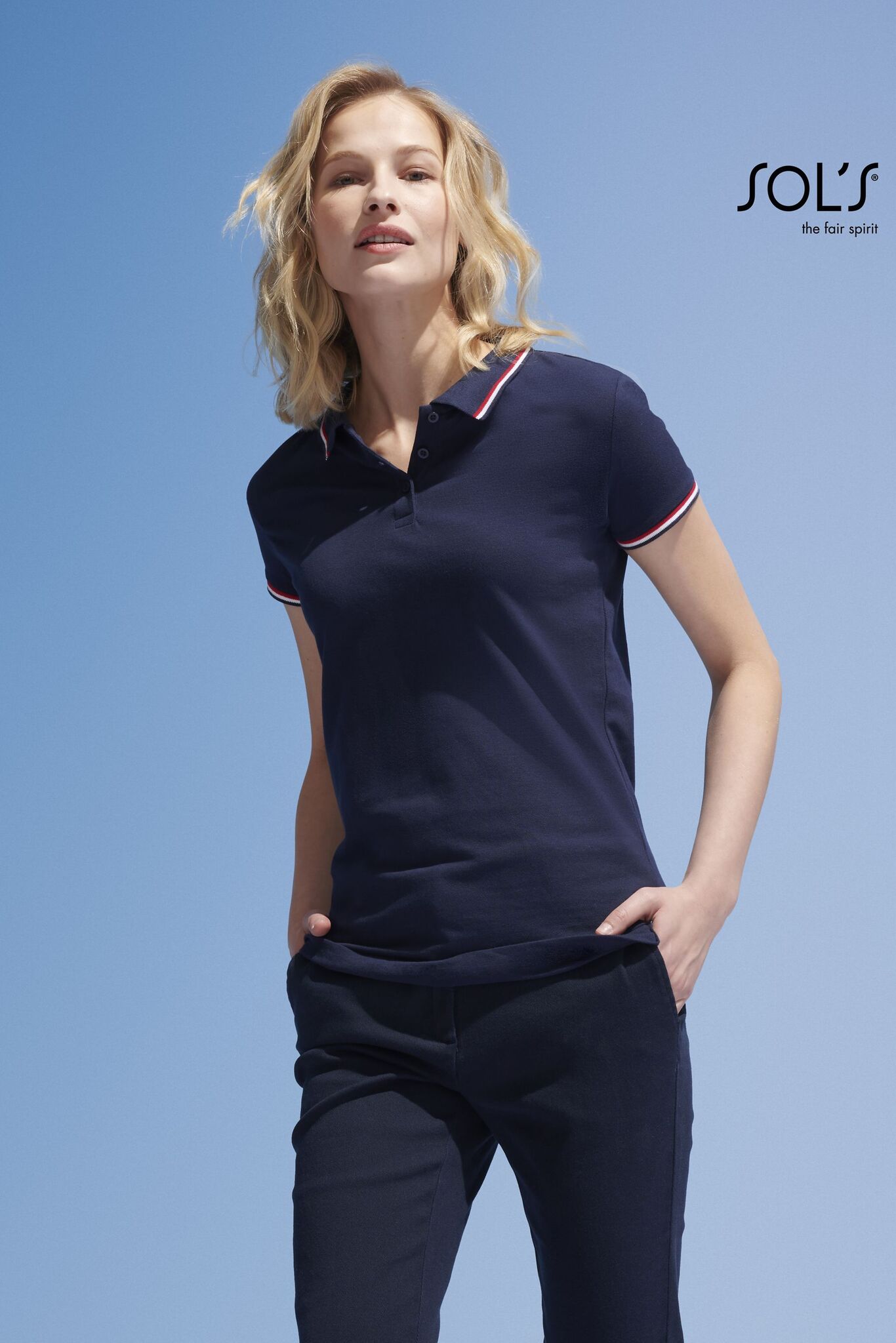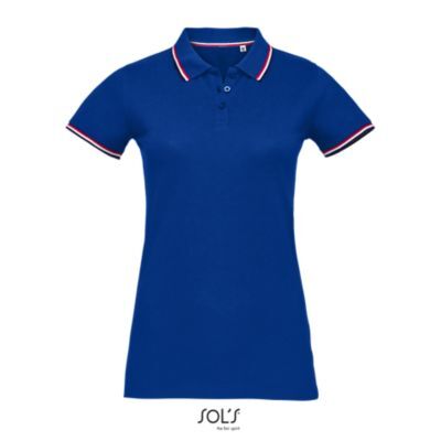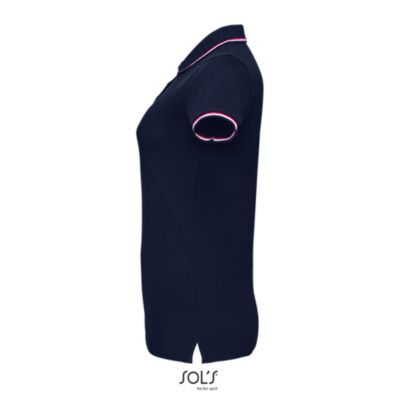 ЖЕНСКАЯ РУБАШКА ПОЛО. Воротник и нижний край рукавов в резинку 1х1; Плетеная укрепляющая тесьма по внутренней стороне ворота; Короткий рукав; Планка с 3 пуговицами; Кроеный трикотаж; Контрастные полоски на воротнике, по низу рукавов, внутри бокового разреза и на внутренней стороне ворота