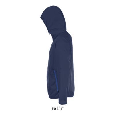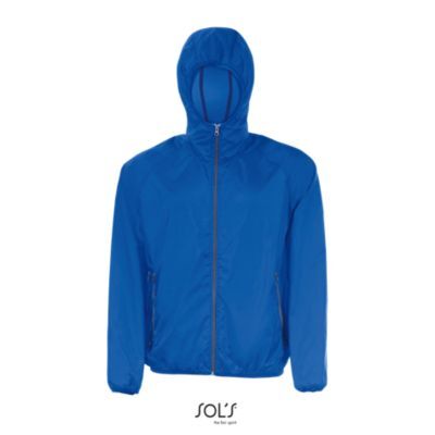 ВЕТРОВКА УНИСЕКС. Молния контрастного цвета; Манжеты, капюшон и низ ветровки на эластичной тесьме; Боковые карманы на молниях контрастного цвета; Рукава реглан; Ветровка легко складывается в карман