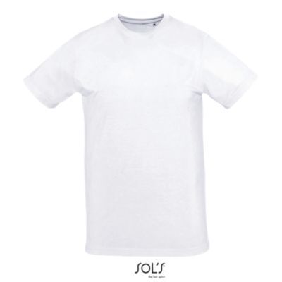 ФУТБОЛКА ДЛЯ СУБЛИМАЦИОННОЙ ПЕЧАТИ С КРУГЛЫМ ВОРОТОМ. Унисекс; на ощупь напоминает хлопок; укрепляющая тесьма по вороту из эластана; короткие рукава; изделие выкроено из трикотажного полотна