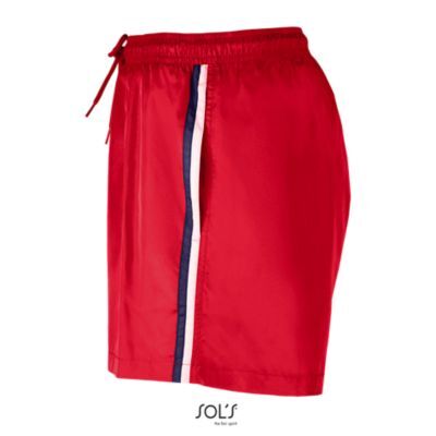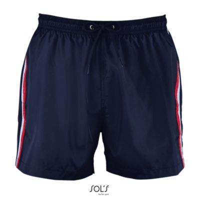 МУЖСКИЕ ТРЕХЦВЕТНЫЕ ПЛАВКИ. Пояс на резинке со стягивающим шнурком в цвет изделия; Два боковых кармана; Задний карман; Трехцветная отделка по бокам
