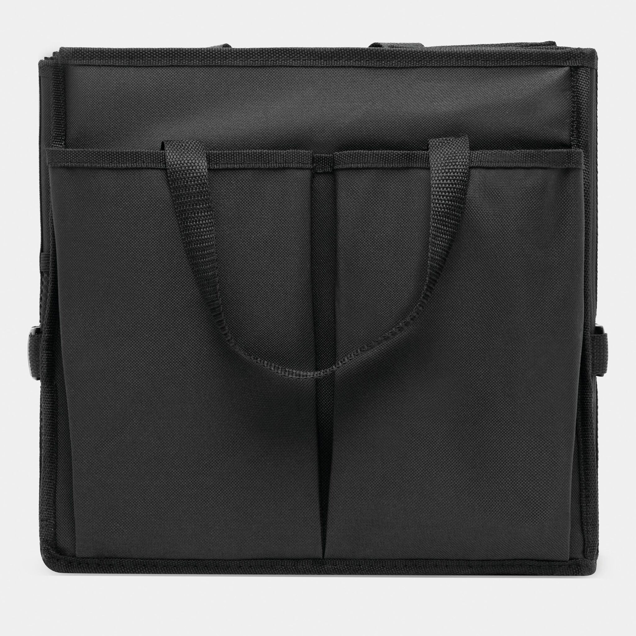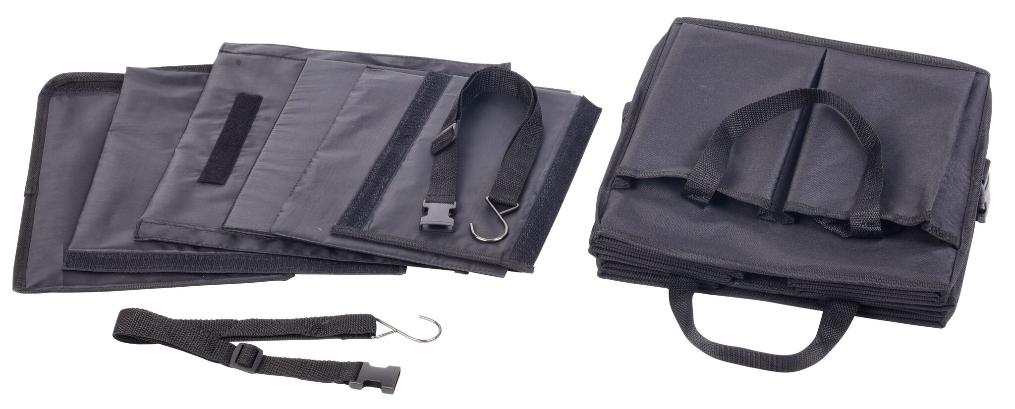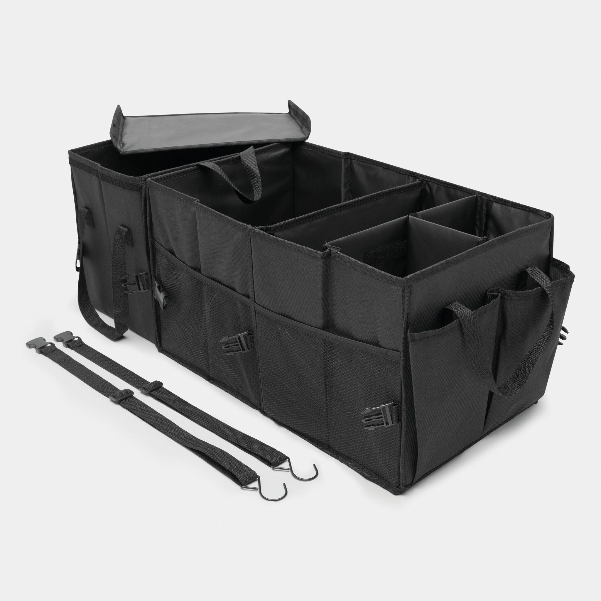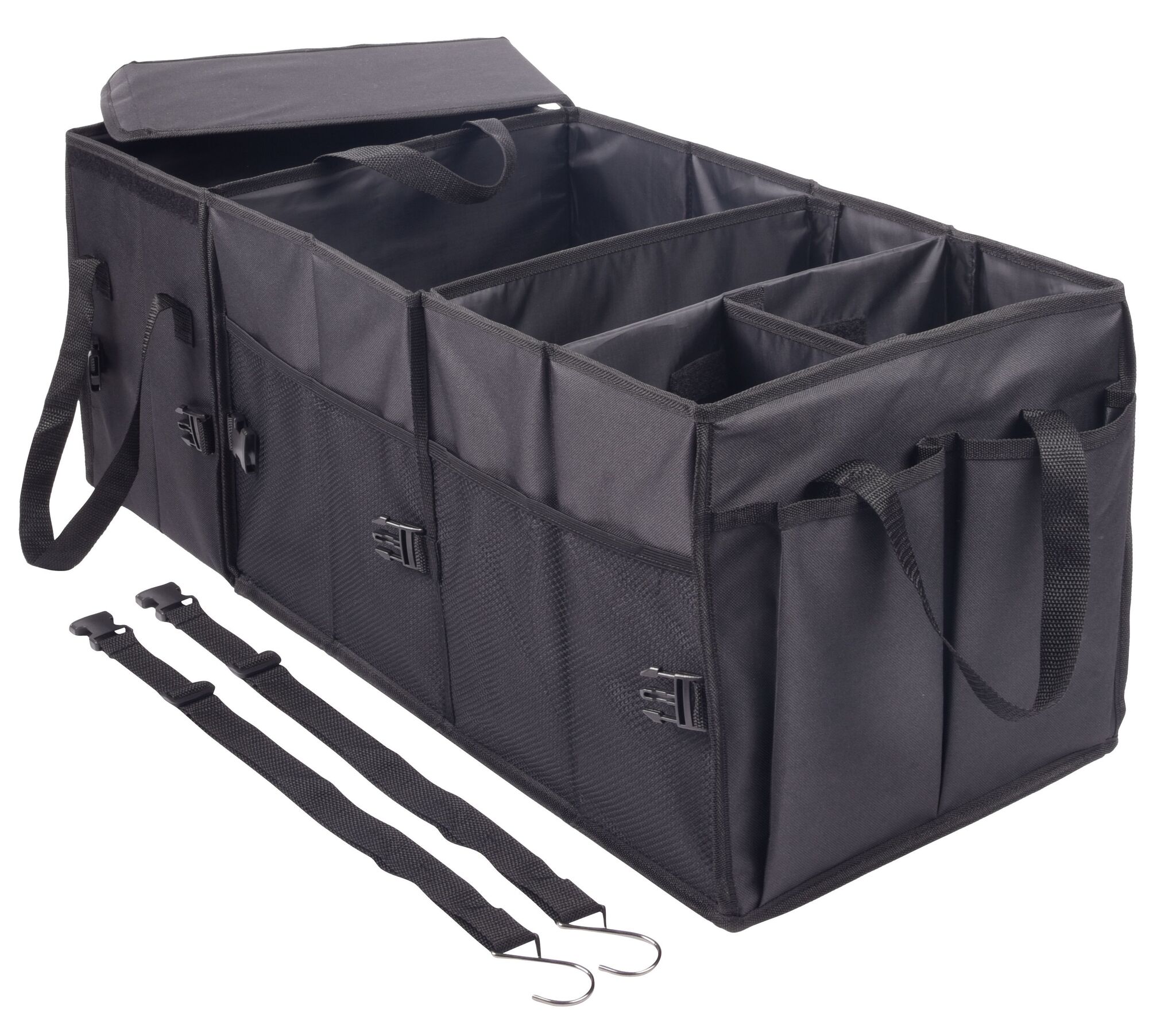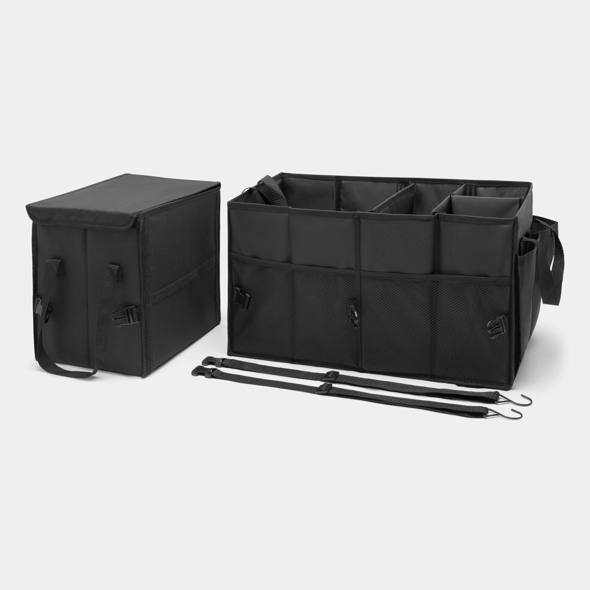 Сумка для автомобильного багажника SUPER GADGET : складная конструкция, состоящая из 2 сумок, которые можно соединить друг с другом с помощью липучки, 1 сумка с крышкой и ручками, 1 большая сумка 3 гибкими перегородками, ручками, 2 боковых кармана и сетчатые передние карманы, укреплённое днище, 2 ремня и многочисленные зажимы, липучка на днище для крепления в багажнике автомобиля