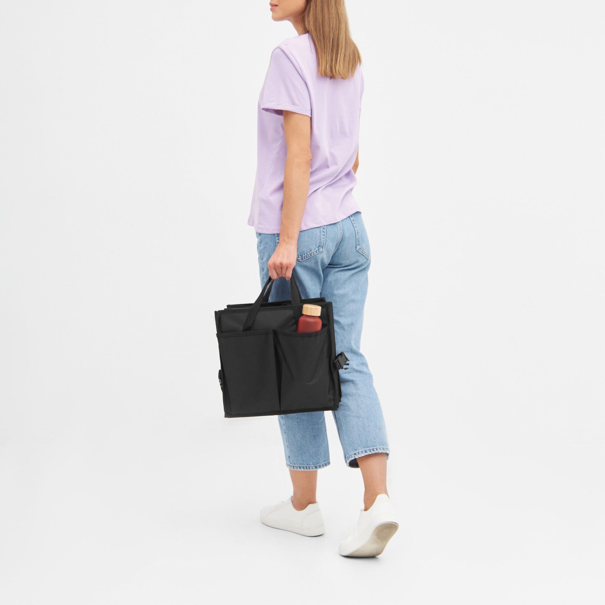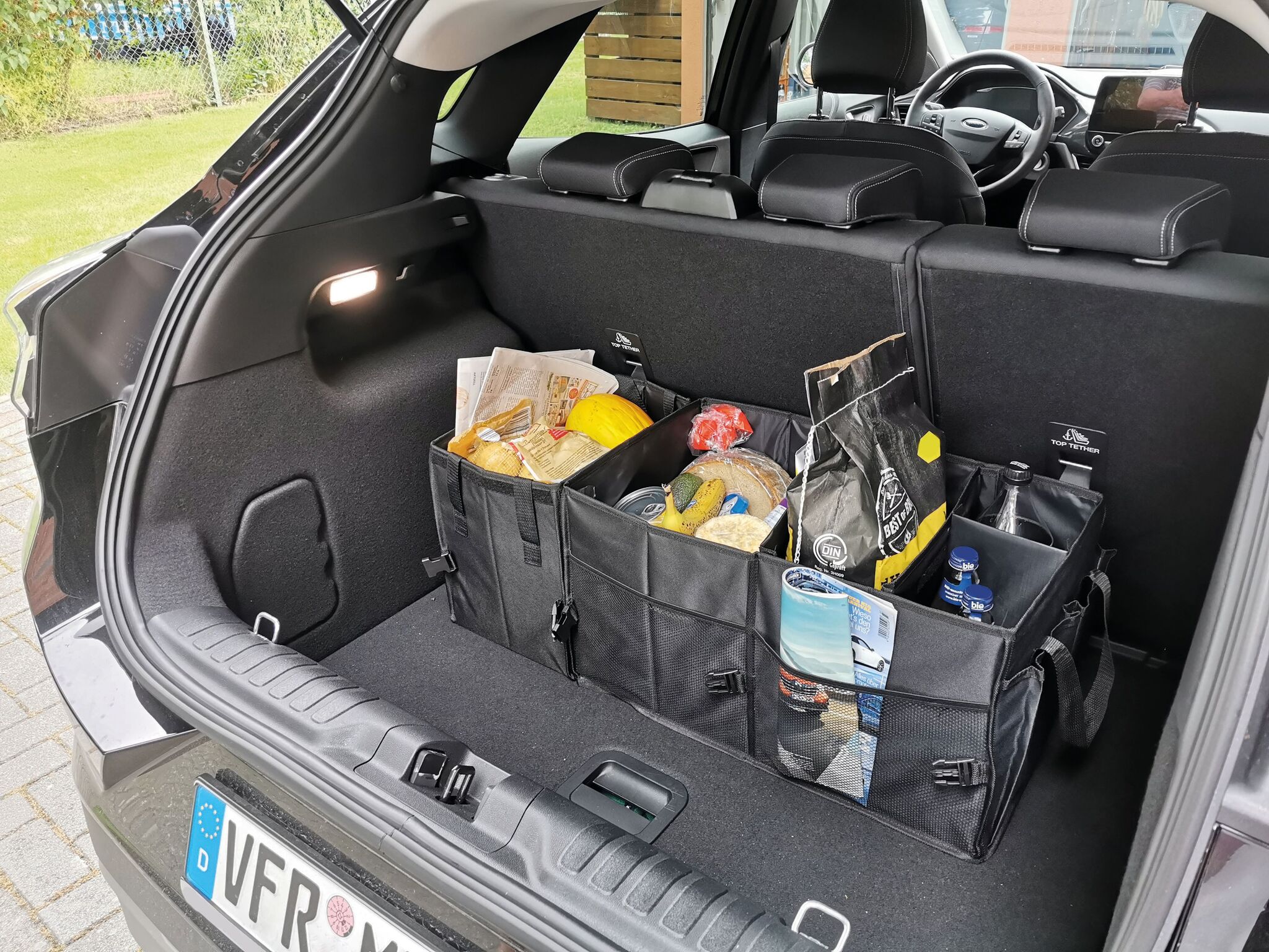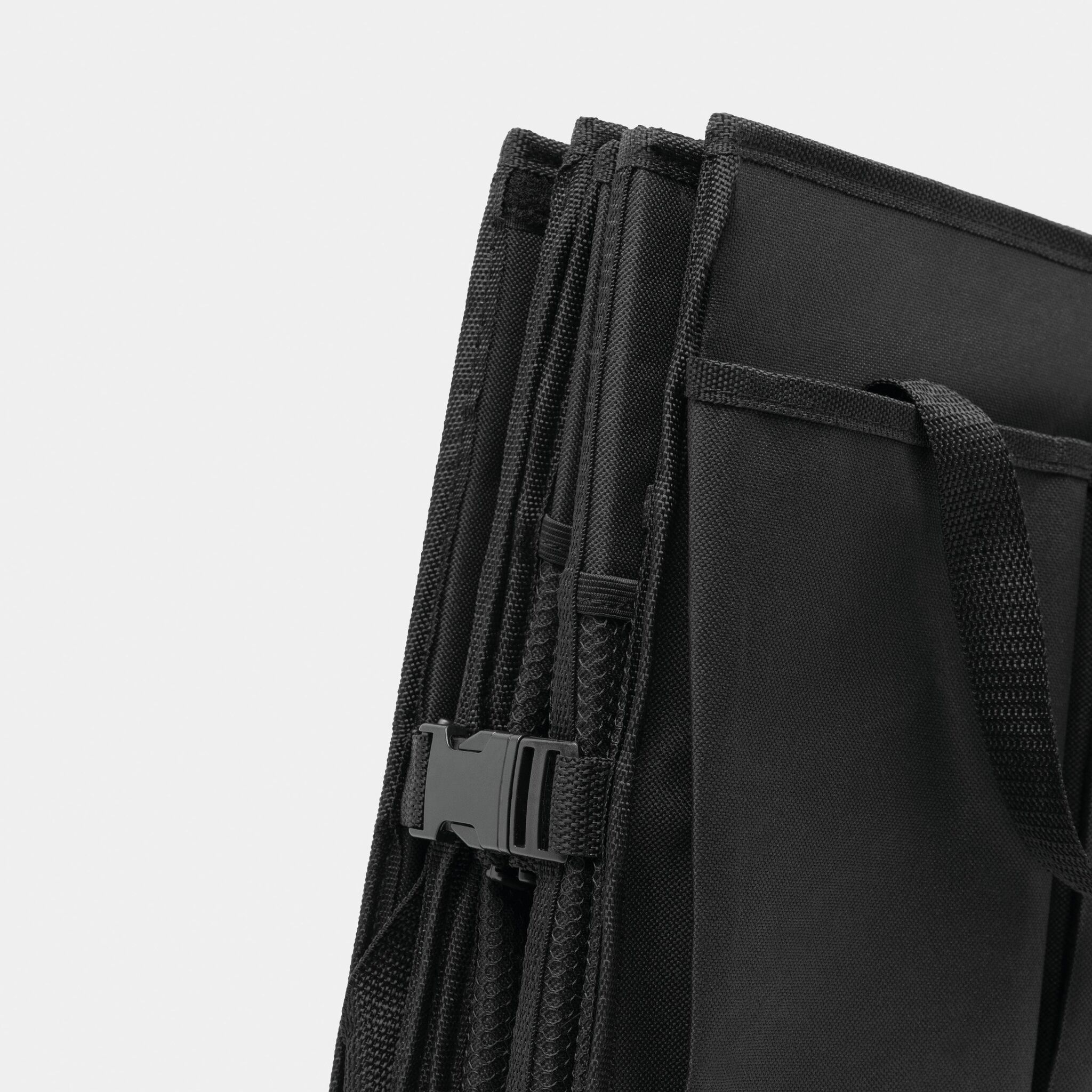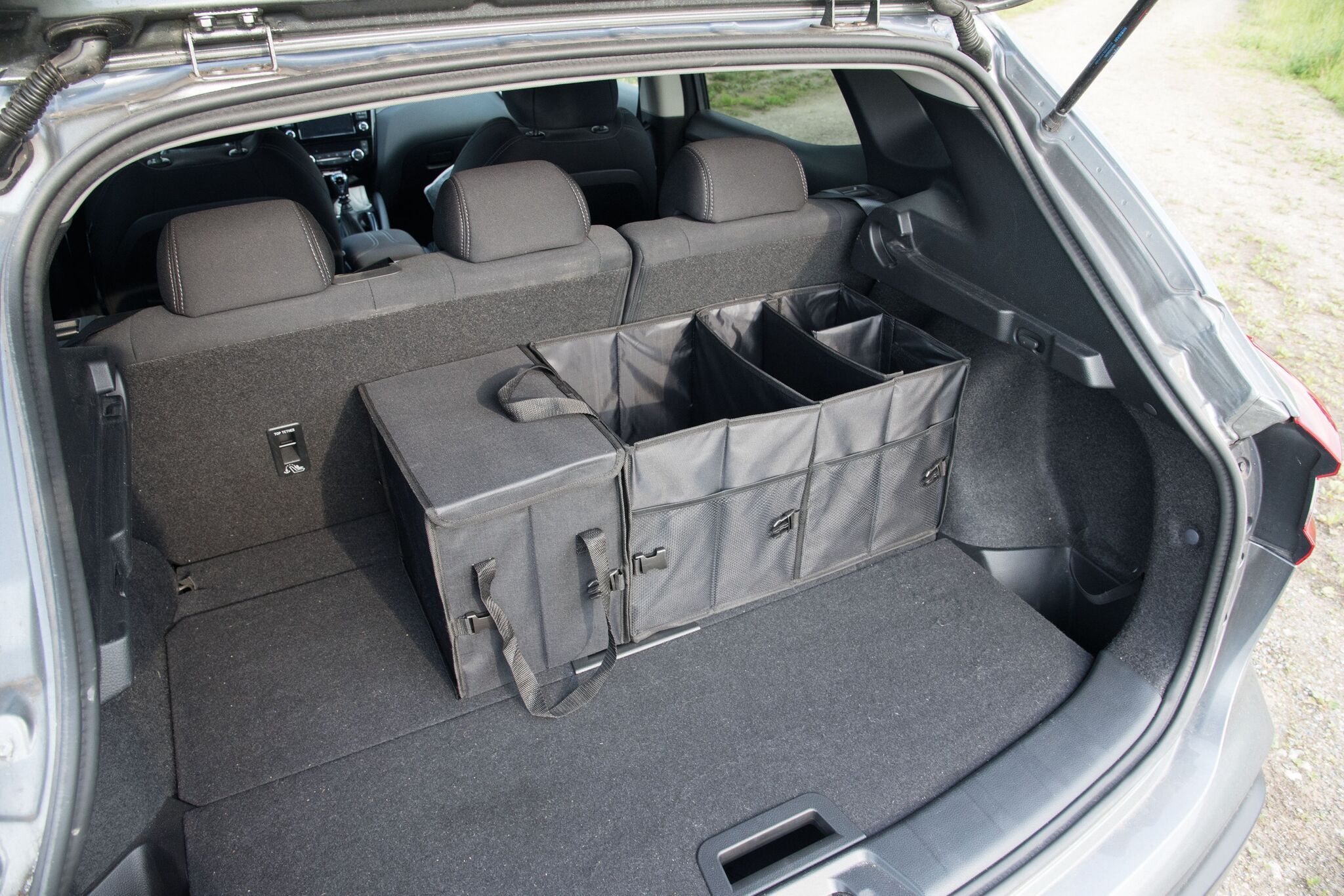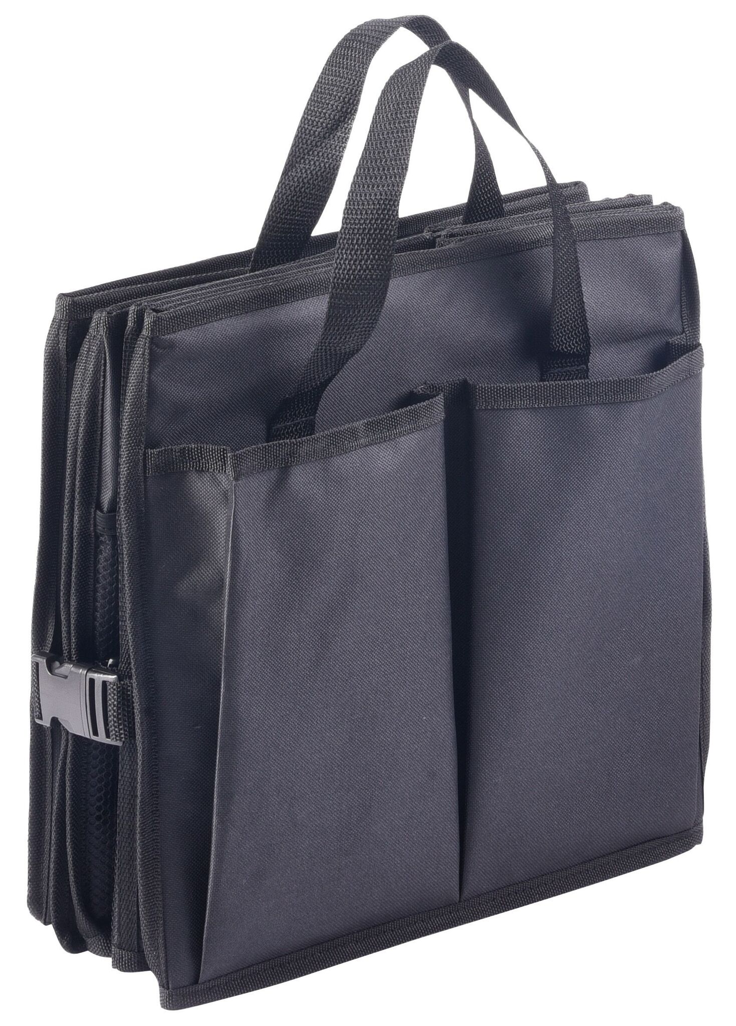 Сумка для автомобильного багажника SUPER GADGET : складная конструкция, состоящая из 2 сумок, которые можно соединить друг с другом с помощью липучки, 1 сумка с крышкой и ручками, 1 большая сумка 3 гибкими перегородками, ручками, 2 боковых кармана и сетчатые передние карманы, укреплённое днище, 2 ремня и многочисленные зажимы, липучка на днище для крепления в багажнике автомобиля