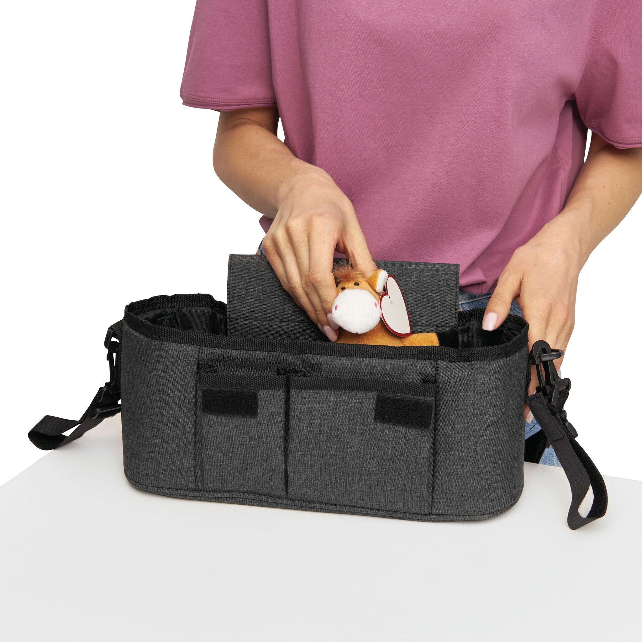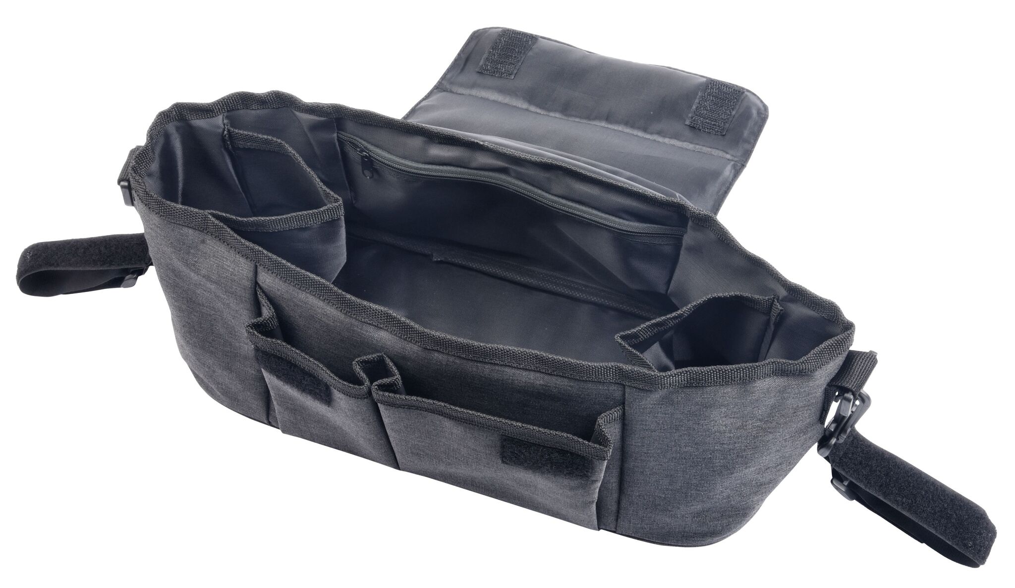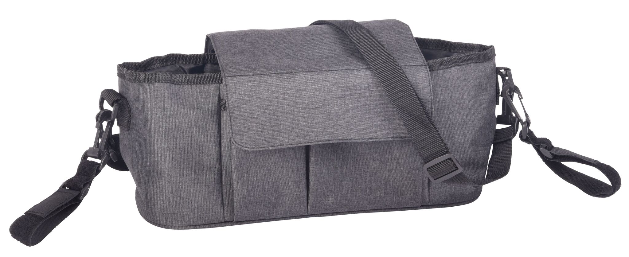 Сумка для детской коляски BABY AID : быстрое и легкое крепление к коляске с помощью съемных петель на липучке, основное отделение с 2-мя держателями для напитков и отделением на молнии, 2 передних кармана, съемный и регулируемый плечевой ремень