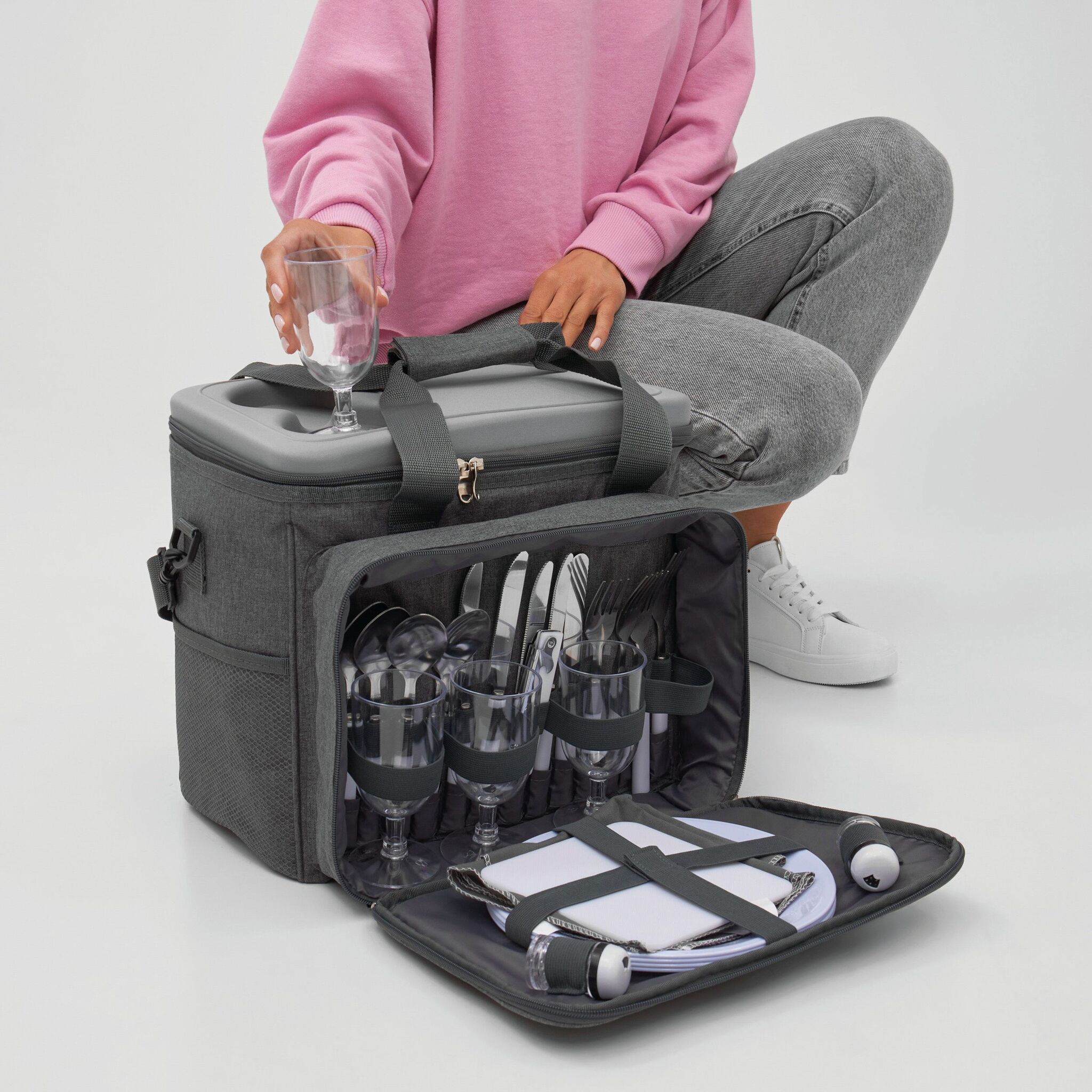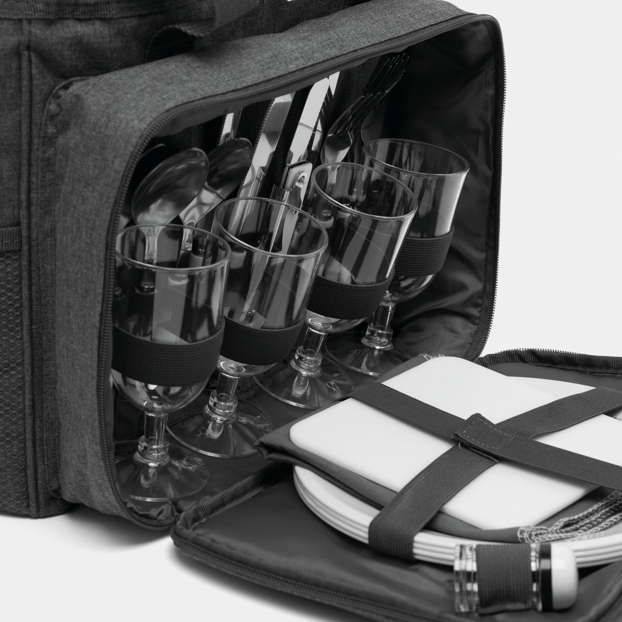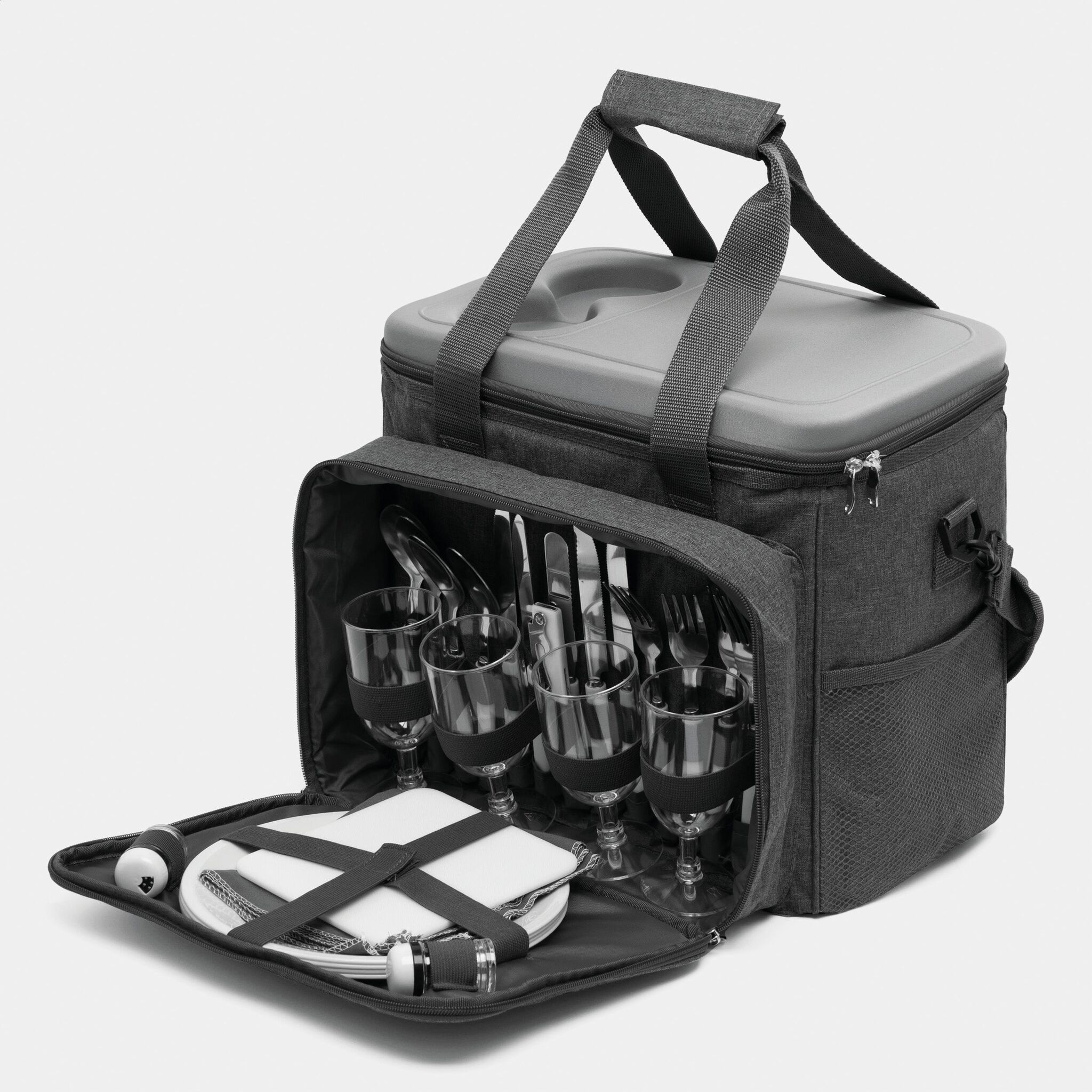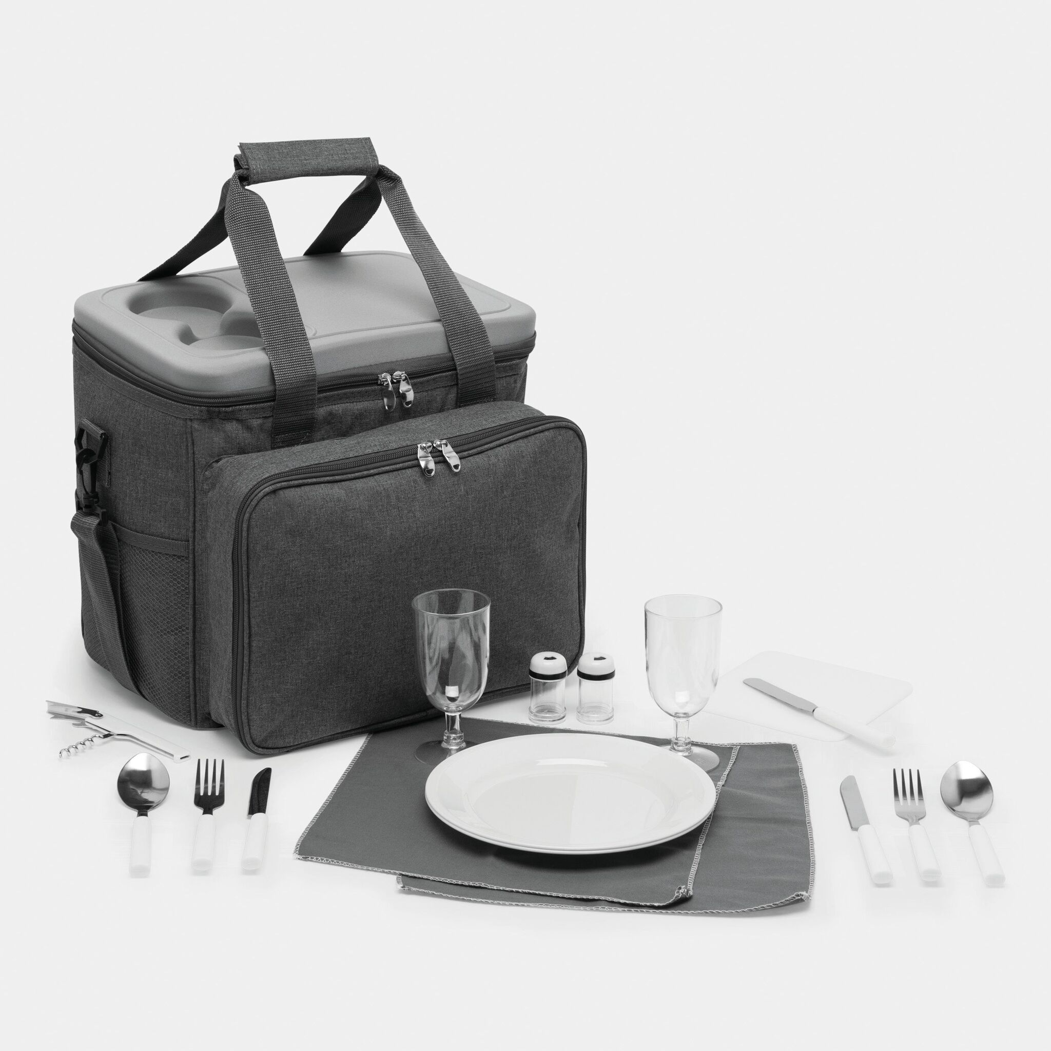 Сумка для пикника SIDE TRIP для 4 персон, изолированный основной отдел на молнии, крышка может послужить вместо столика, в переднем отделе на молнии: пластиковые тарелки, пластиковые бокалы для вина, нож-сомелье, салфетки из материала, набор для соли и перца, разделочная доска; 2 боковых кармана, регулируемый плечевой ремень, 2 ручки