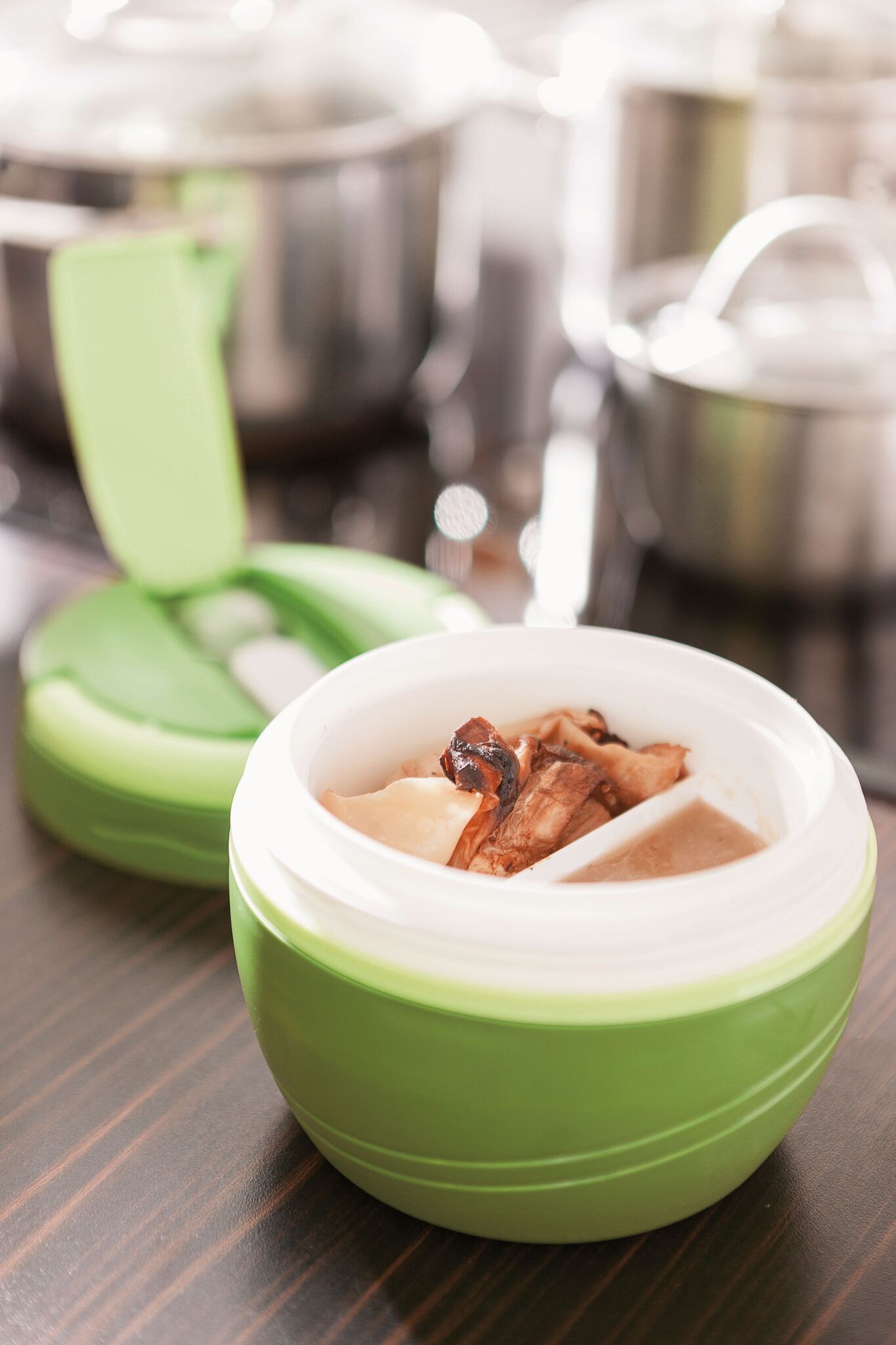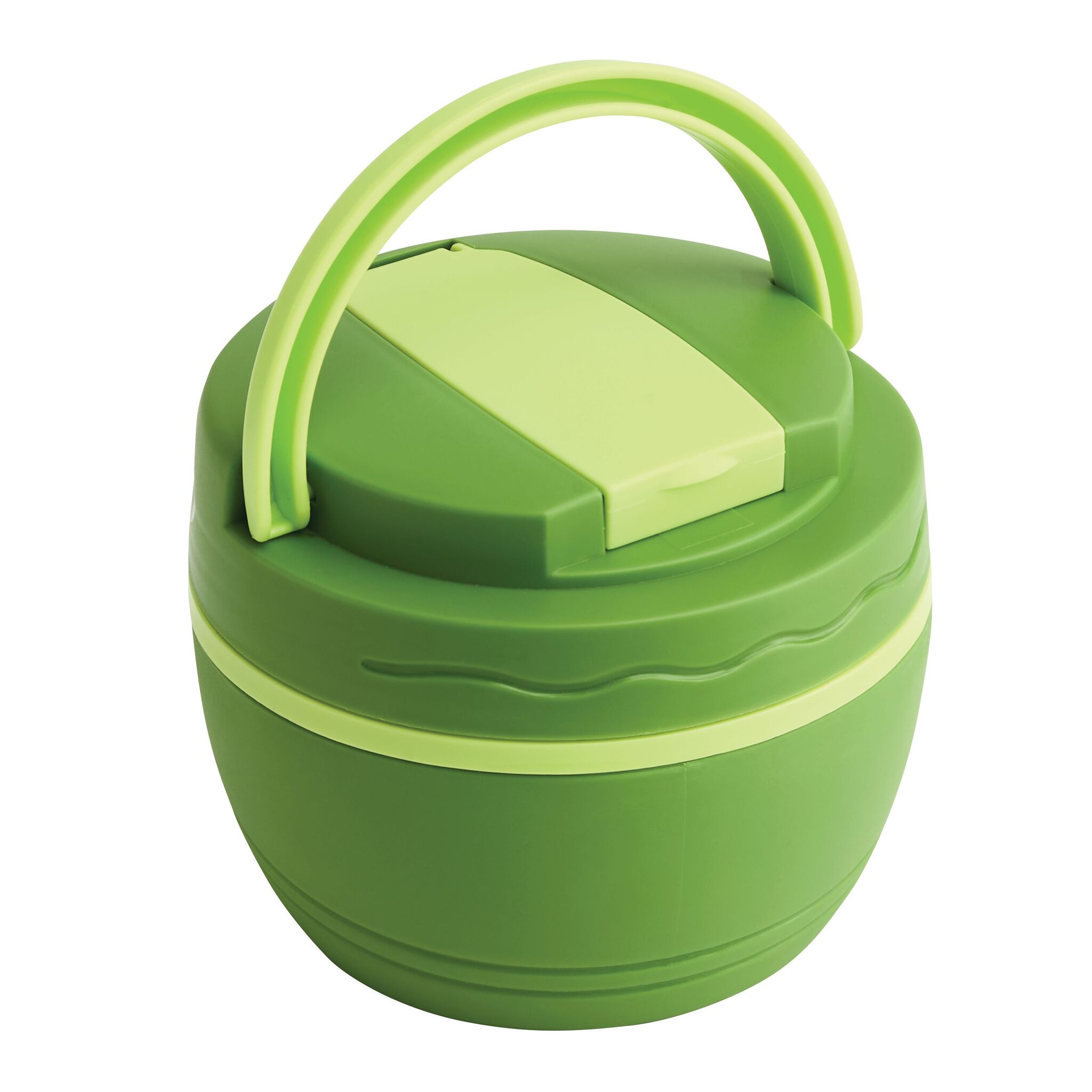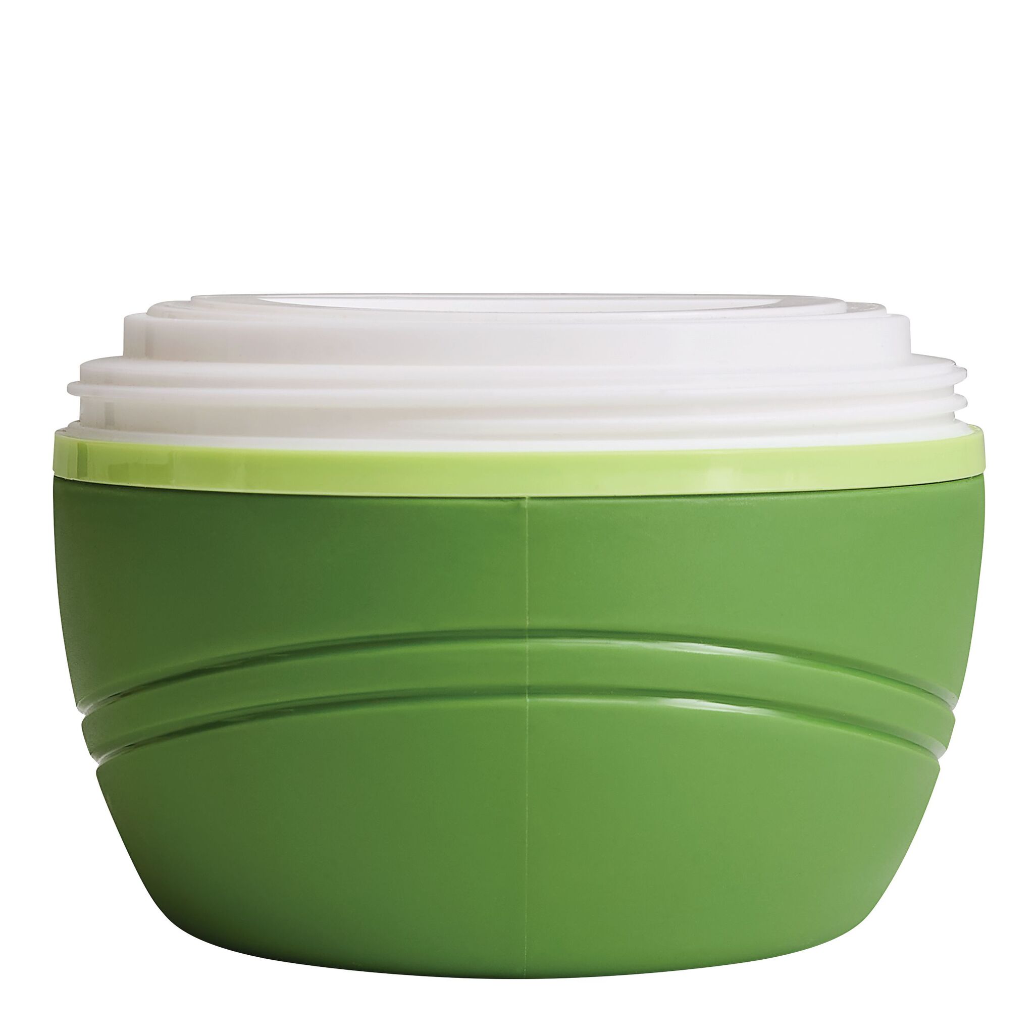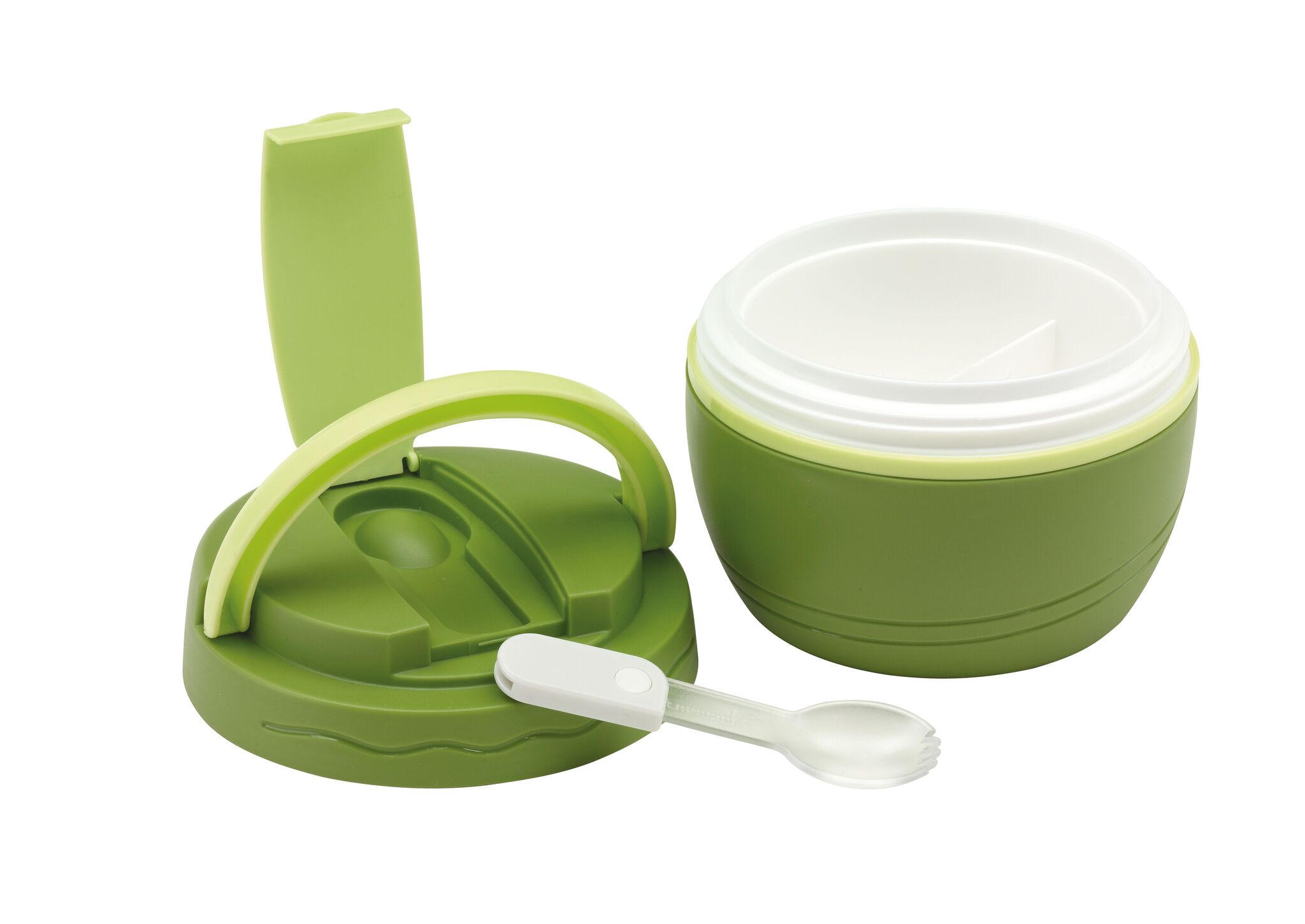 Термический контейнер JOKO внутренняя съёмная вставка (подходит для микроволновой печи) с 2 перегородками, прикручивающаяся крышка со встроенной ручкой и местом для хранения складной вилки-ножа. Держит пищу холодной и горячей до 4 часов, объём 450 мл.