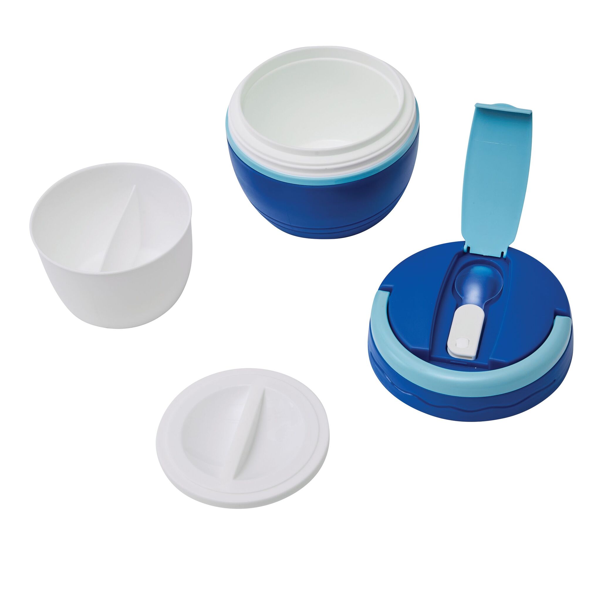 Термический контейнер JOKO внутренняя съёмная вставка (подходит для микроволновой печи) с 2 перегородками, прикручивающаяся крышка со встроенной ручкой и местом для хранения складной вилки-ножа. Держит пищу холодной и горячей до 4 часов, объём 450 мл.