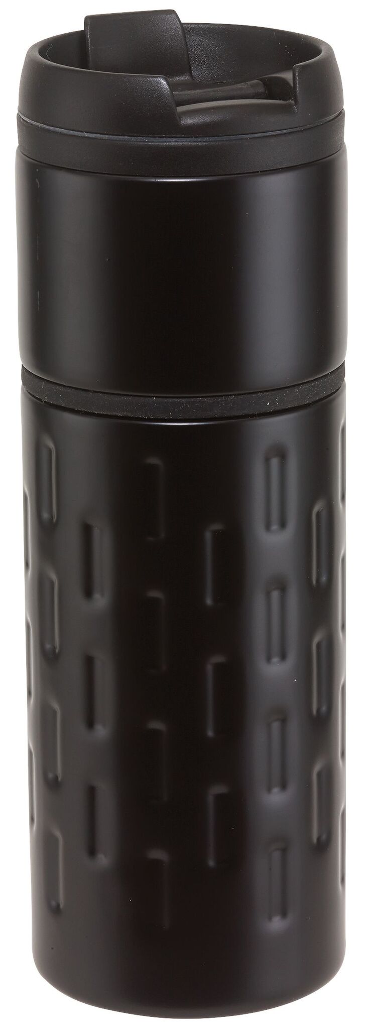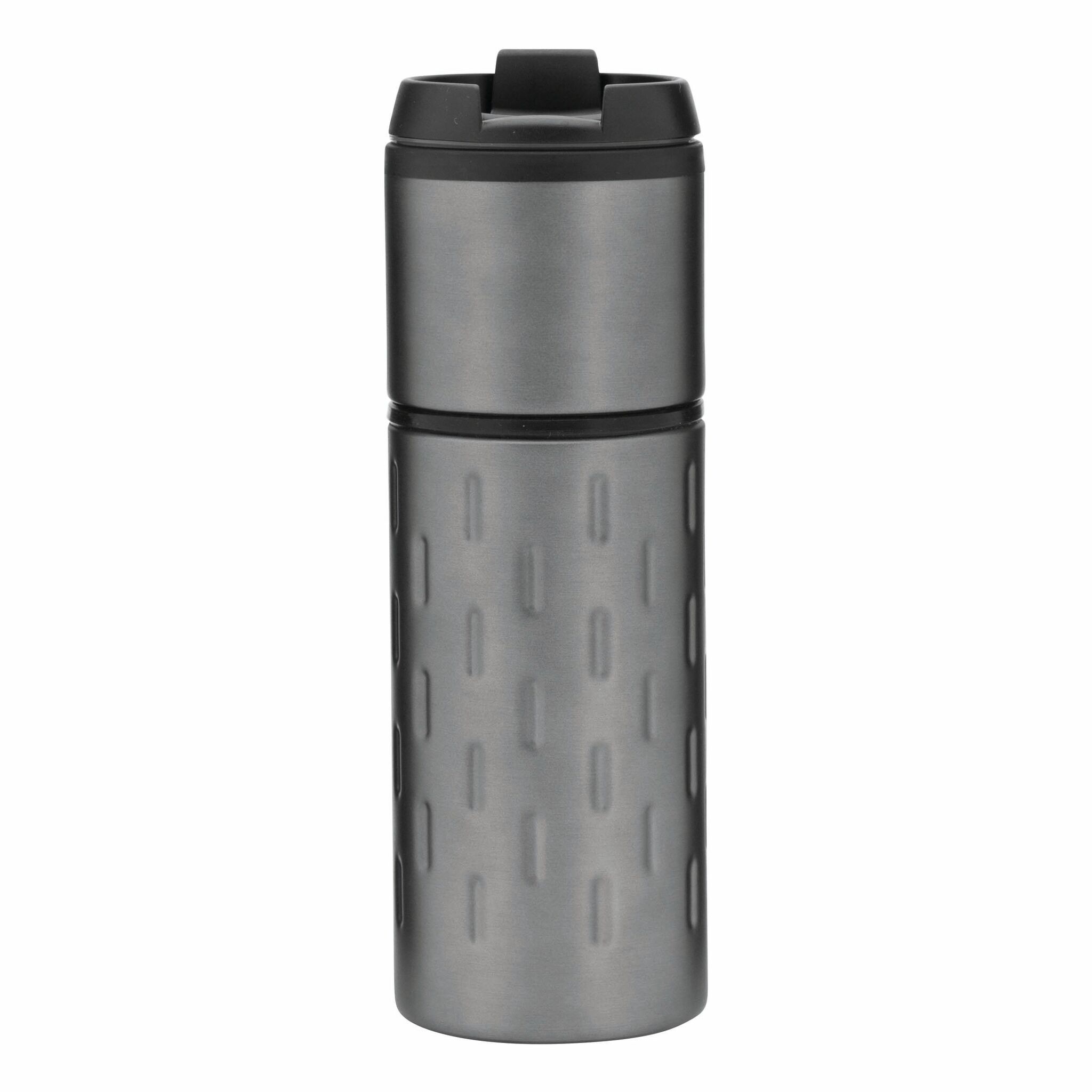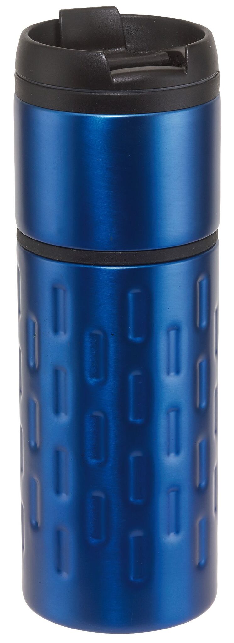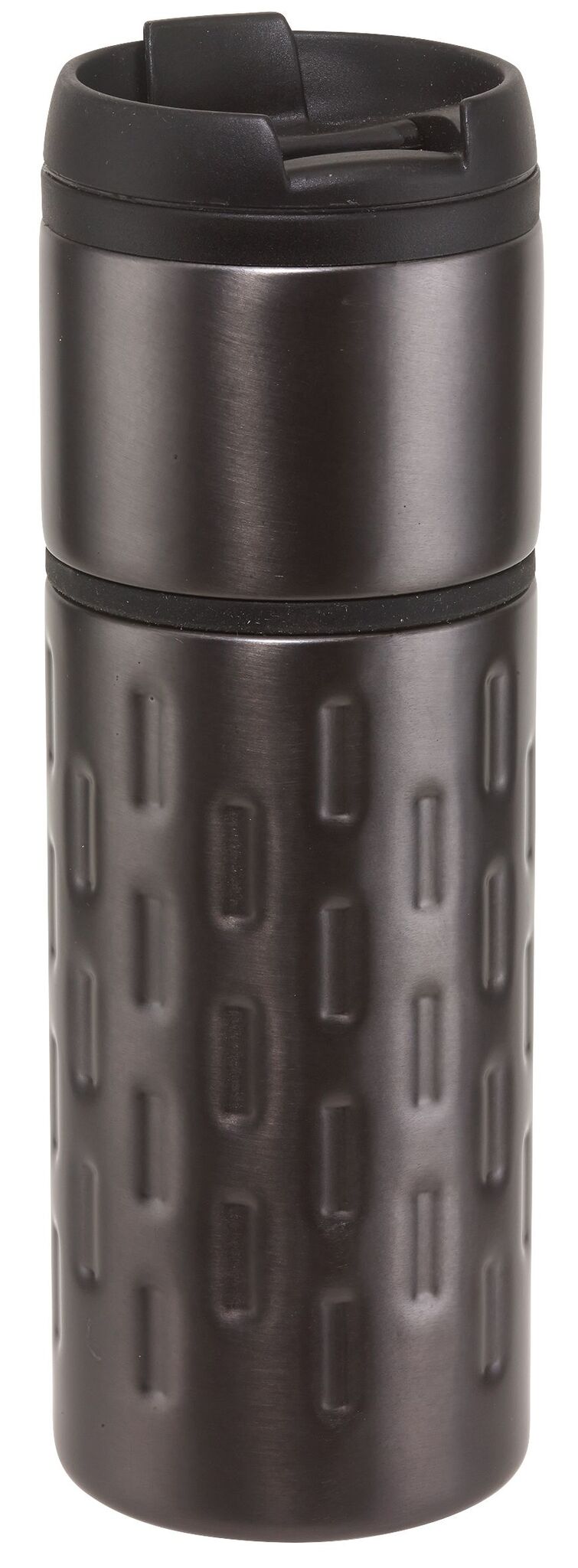 Термо кружка с дшойными EXCLUSIVE LIQUID снаружи из нержавеющей стали с футуристическим дизайном с цветным силиконовым, внутри пластик; съемная пластиковая крышка со складным отверстием для питья, прорезинена с низу для лучшего сцепления, объём ок. 400 мл.
