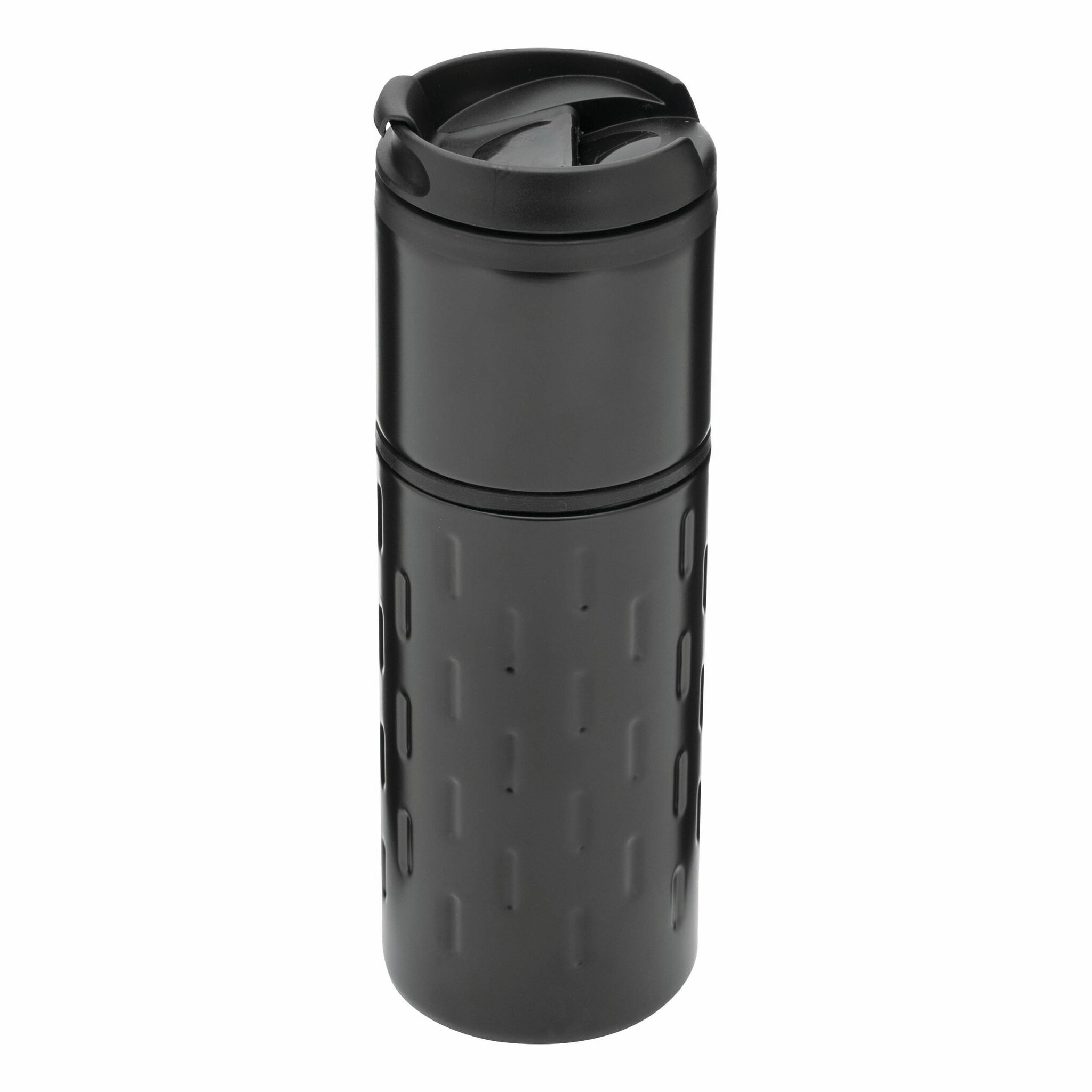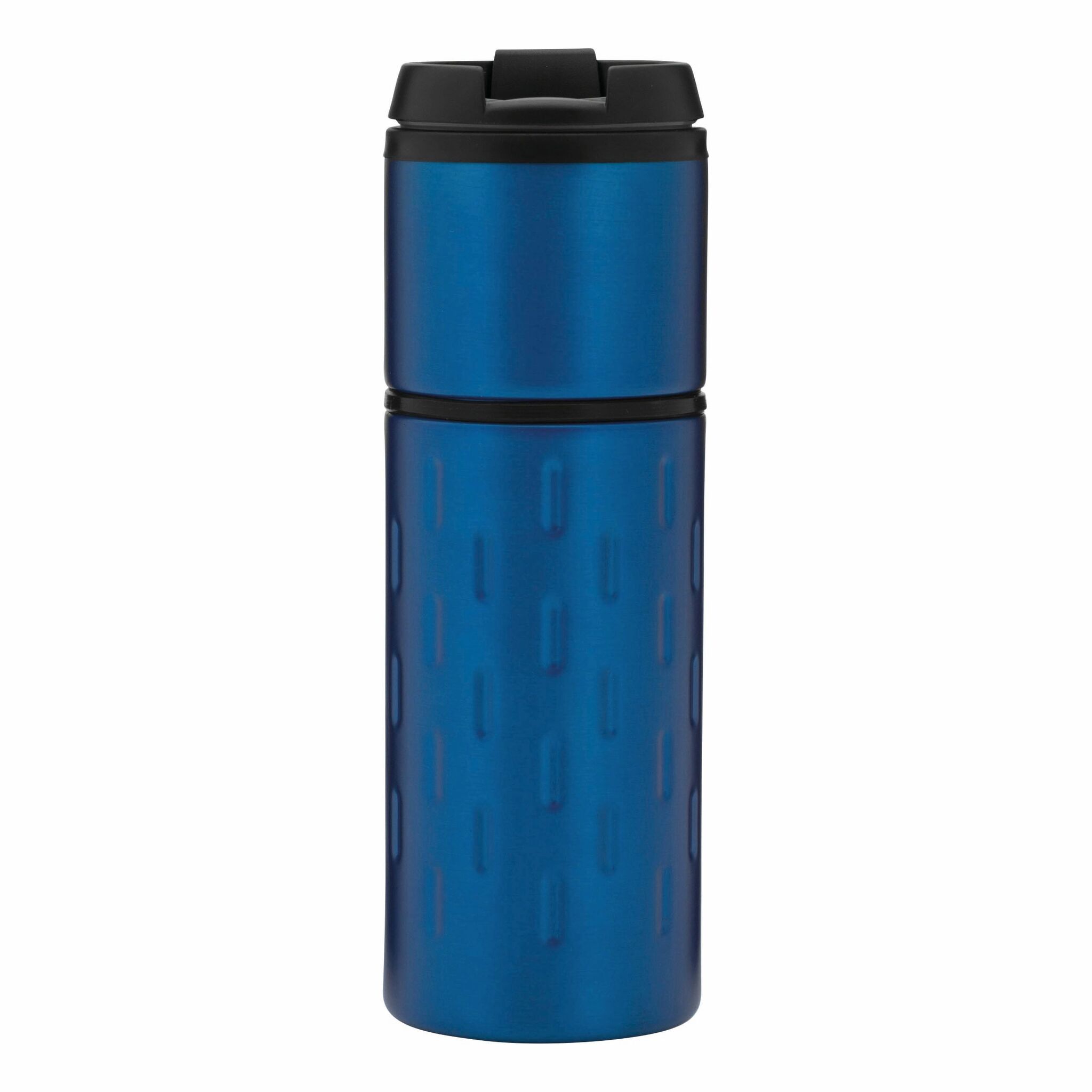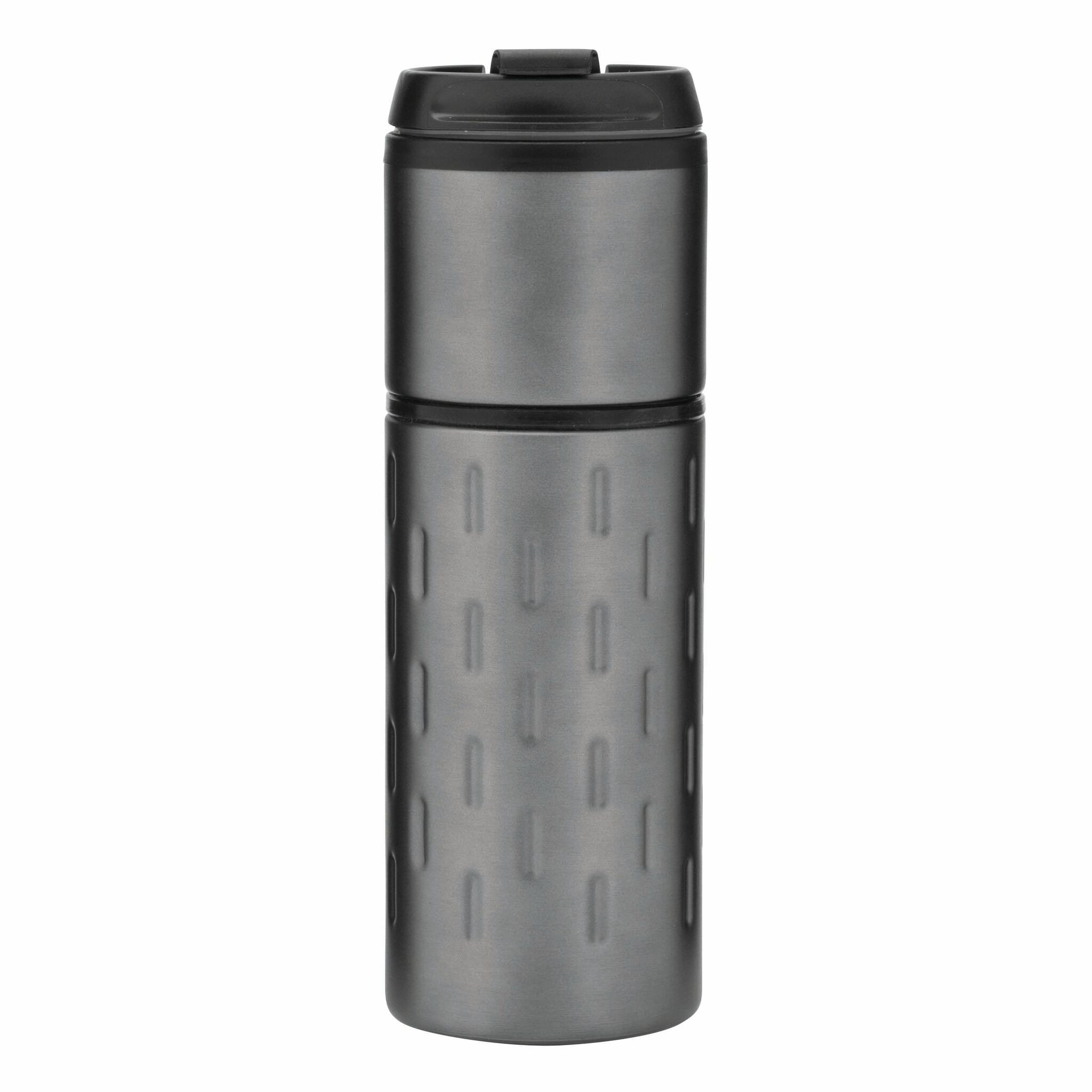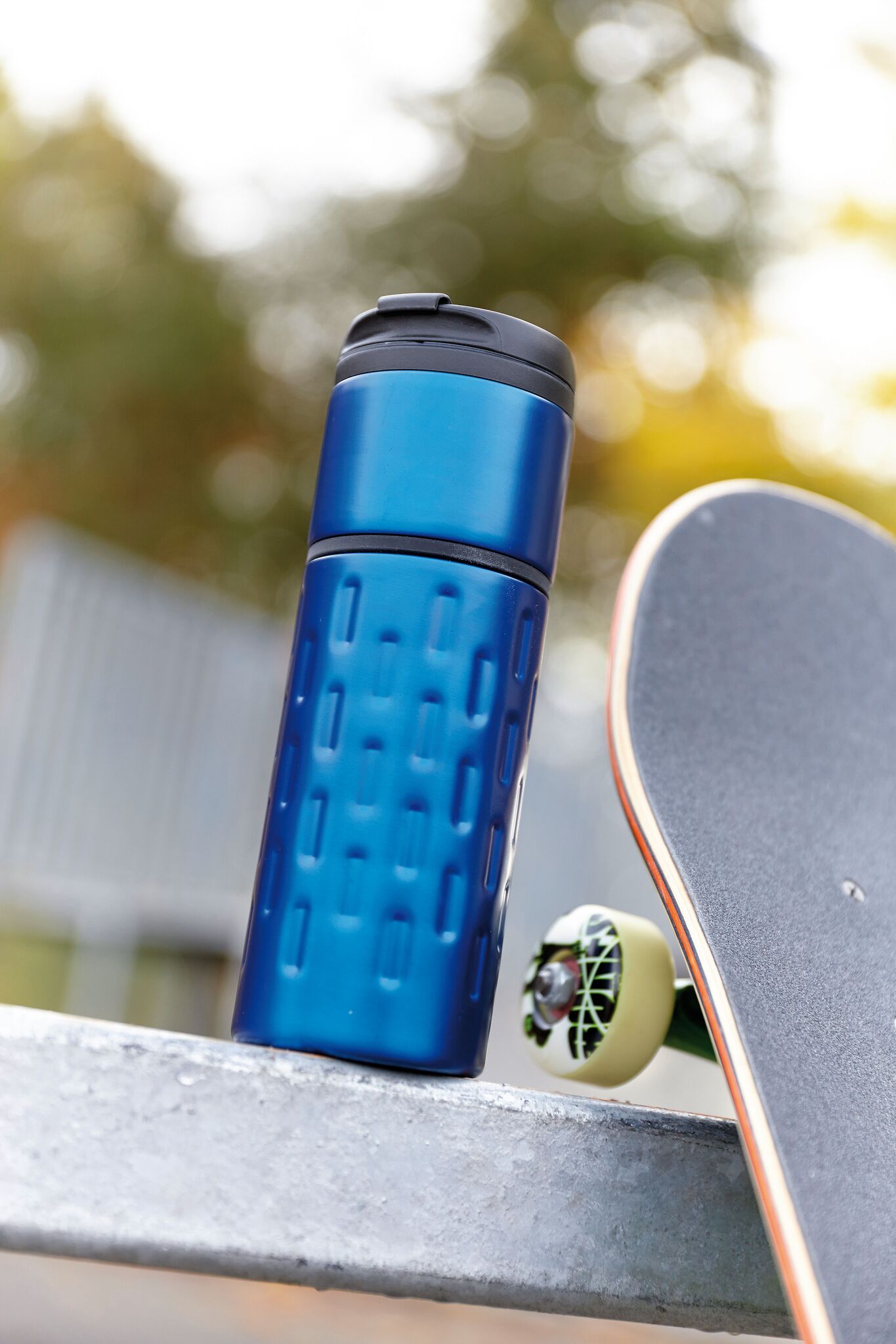 Термо кружка с дшойными EXCLUSIVE LIQUID снаружи из нержавеющей стали с футуристическим дизайном с цветным силиконовым, внутри пластик; съемная пластиковая крышка со складным отверстием для питья, прорезинена с низу для лучшего сцепления, объём ок. 400 мл.