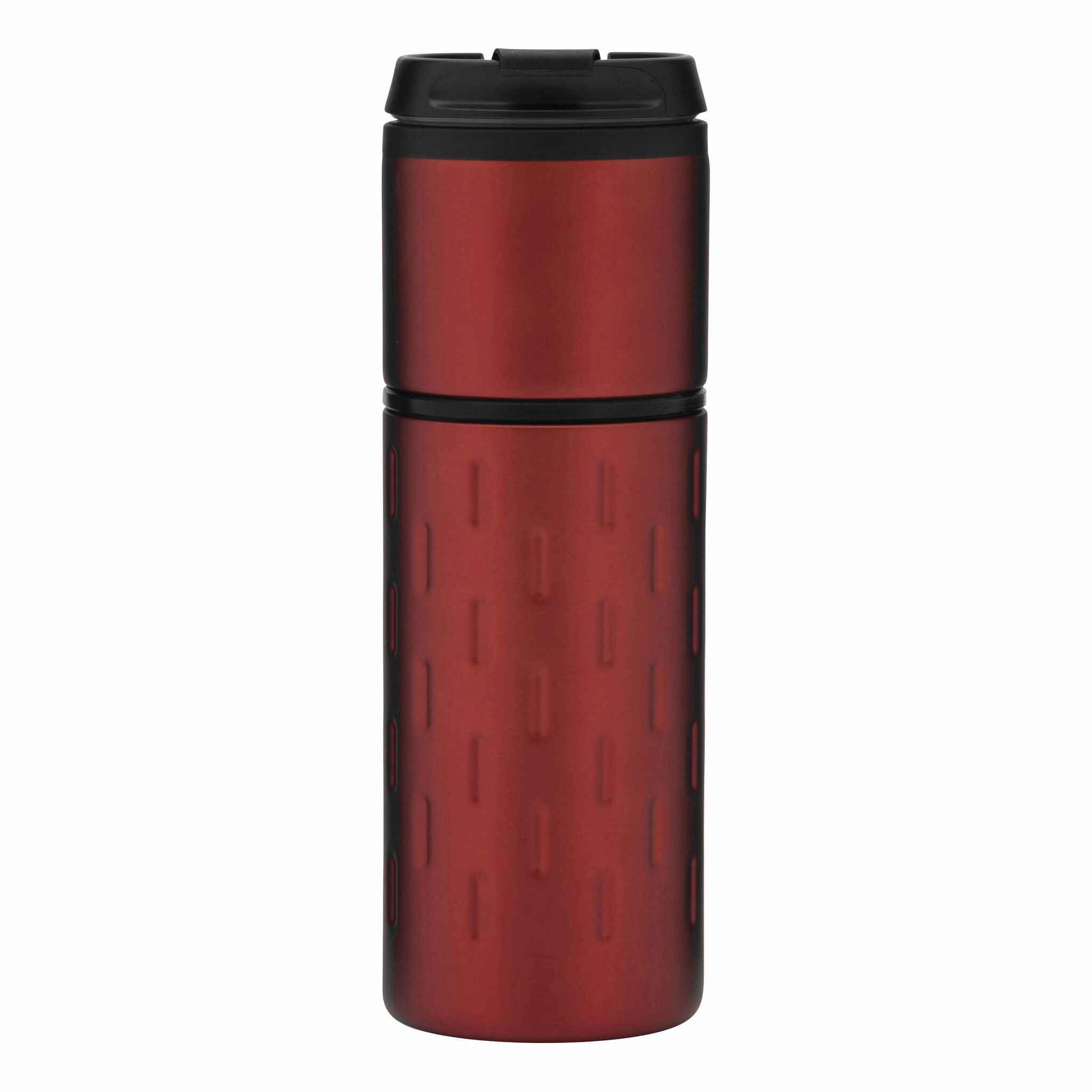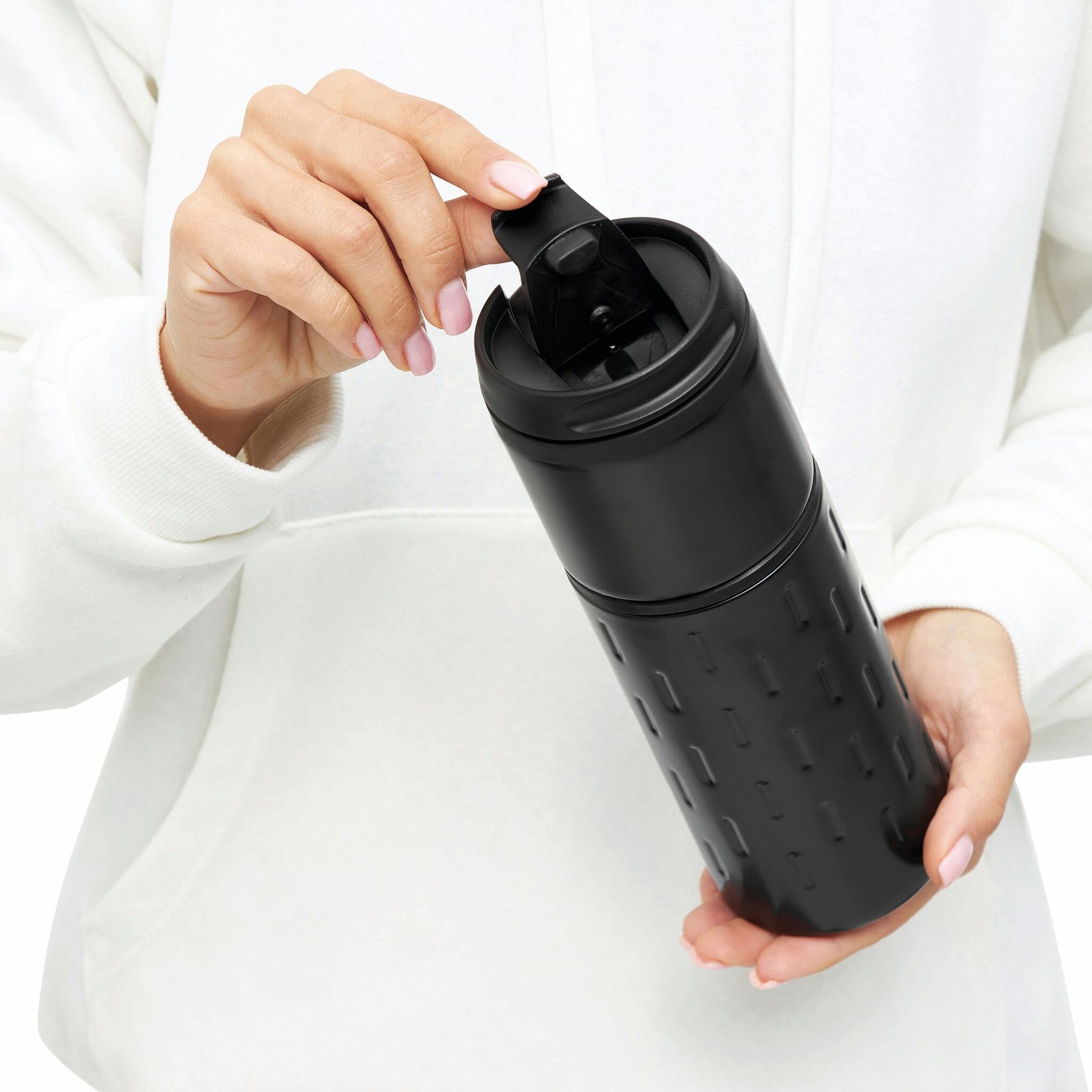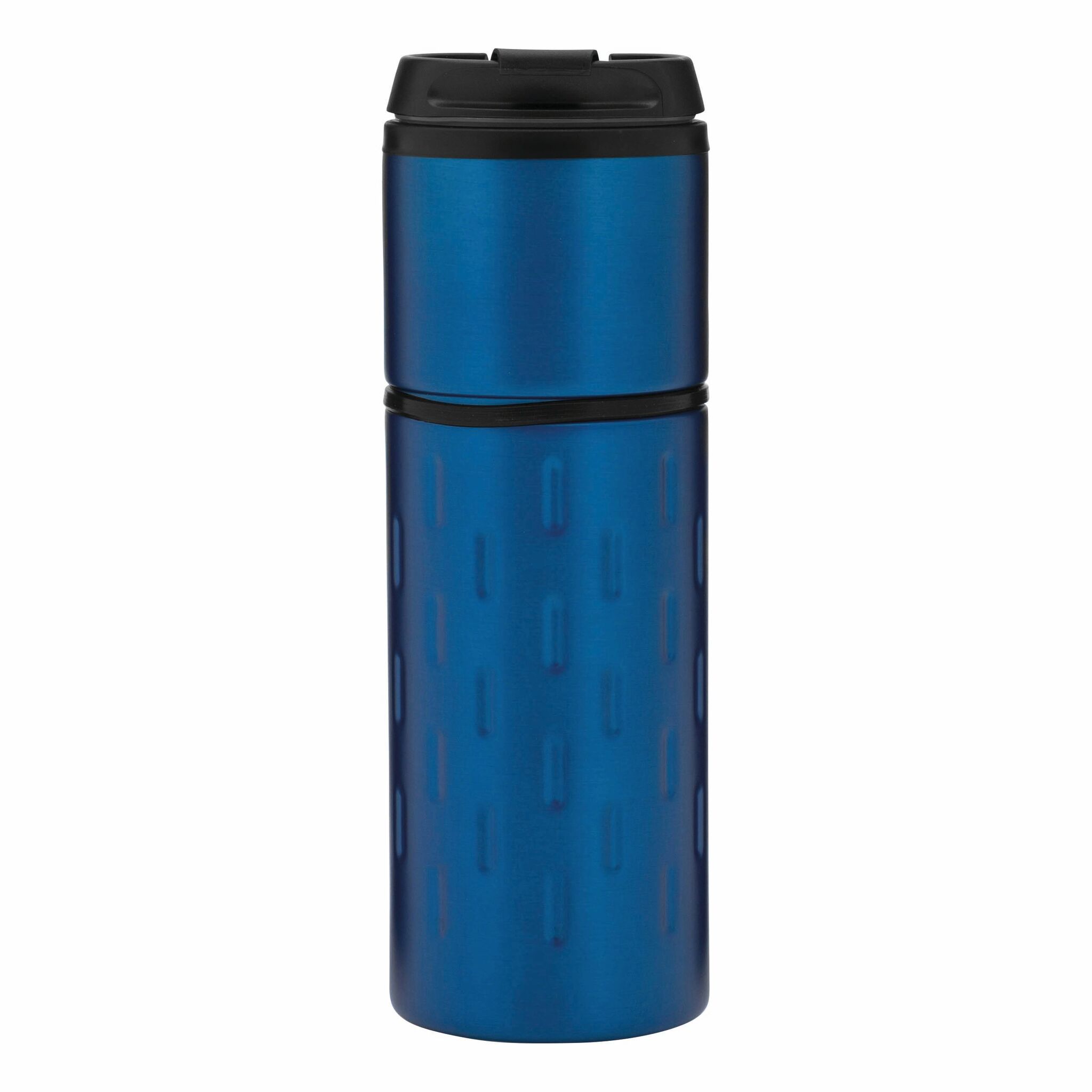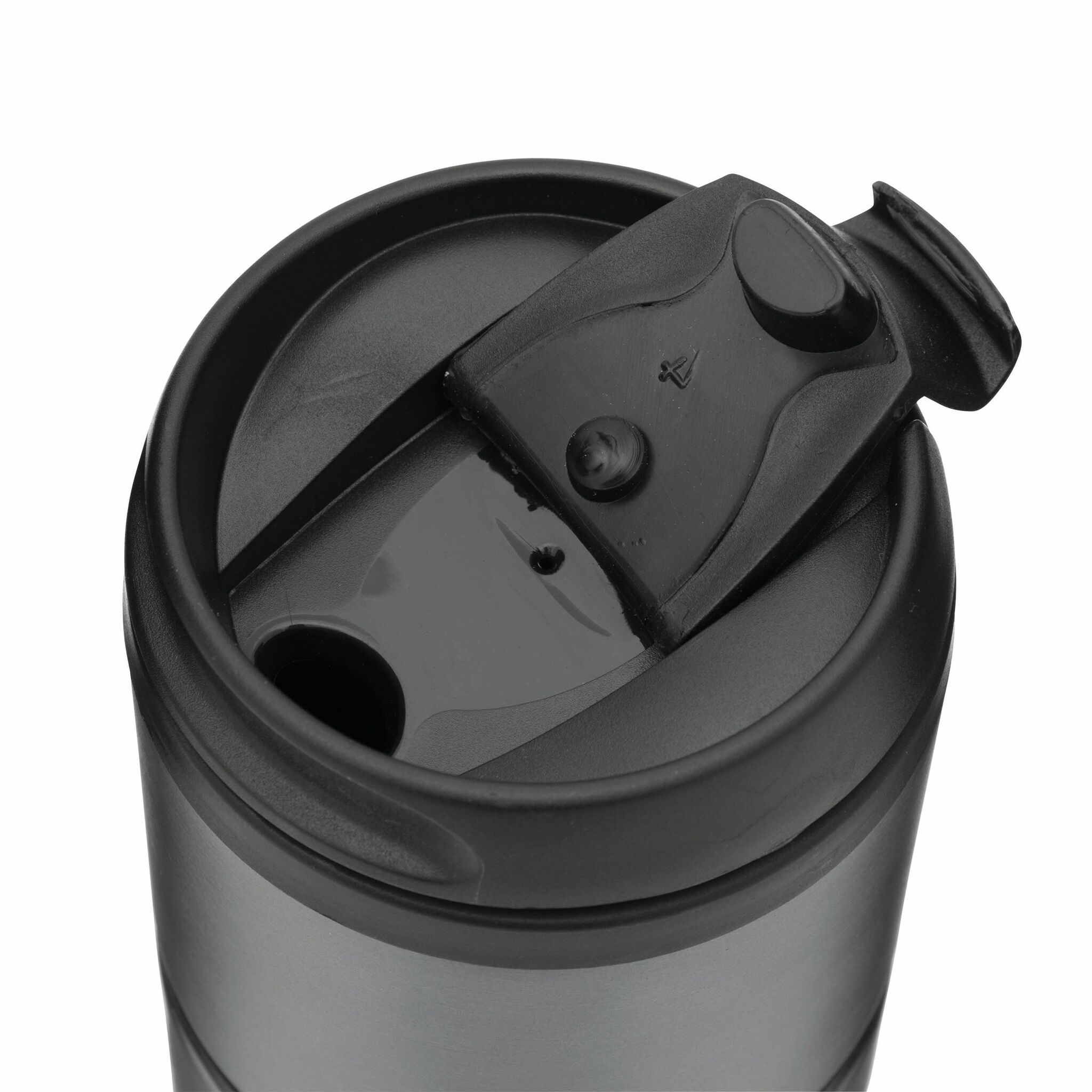 Термо кружка с дшойными EXCLUSIVE LIQUID снаружи из нержавеющей стали с футуристическим дизайном с цветным силиконовым, внутри пластик; съемная пластиковая крышка со складным отверстием для питья, прорезинена с низу для лучшего сцепления, объём ок. 400 мл.