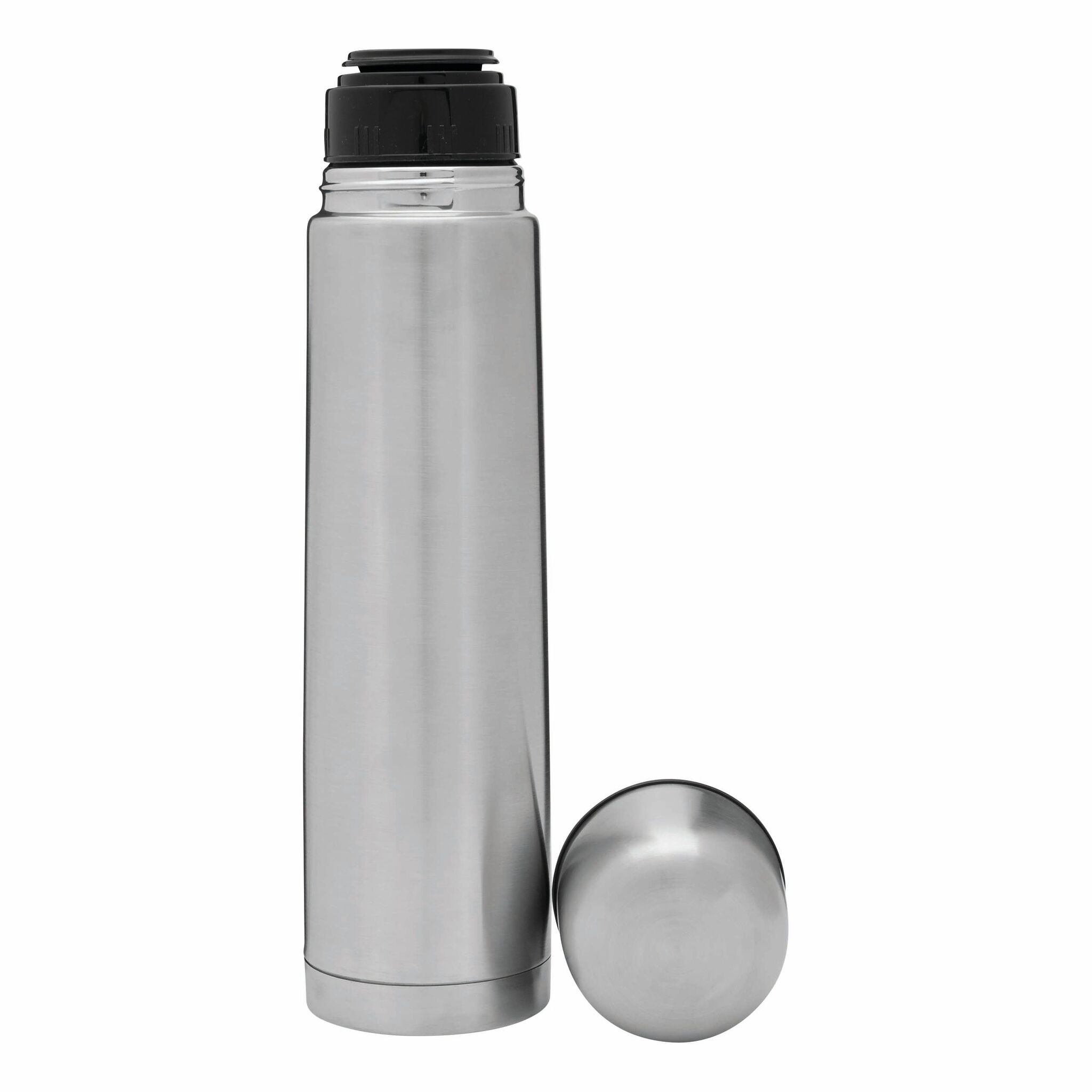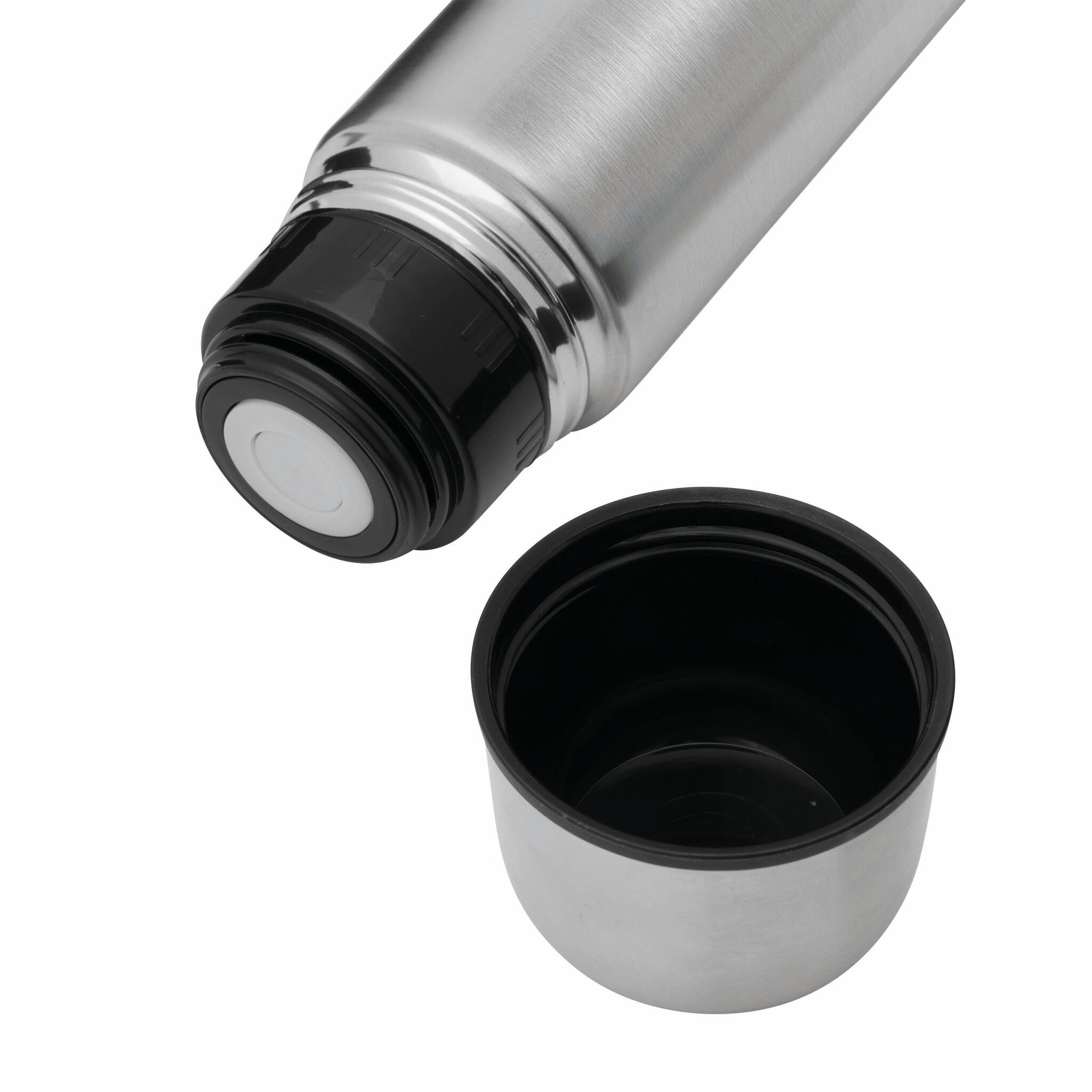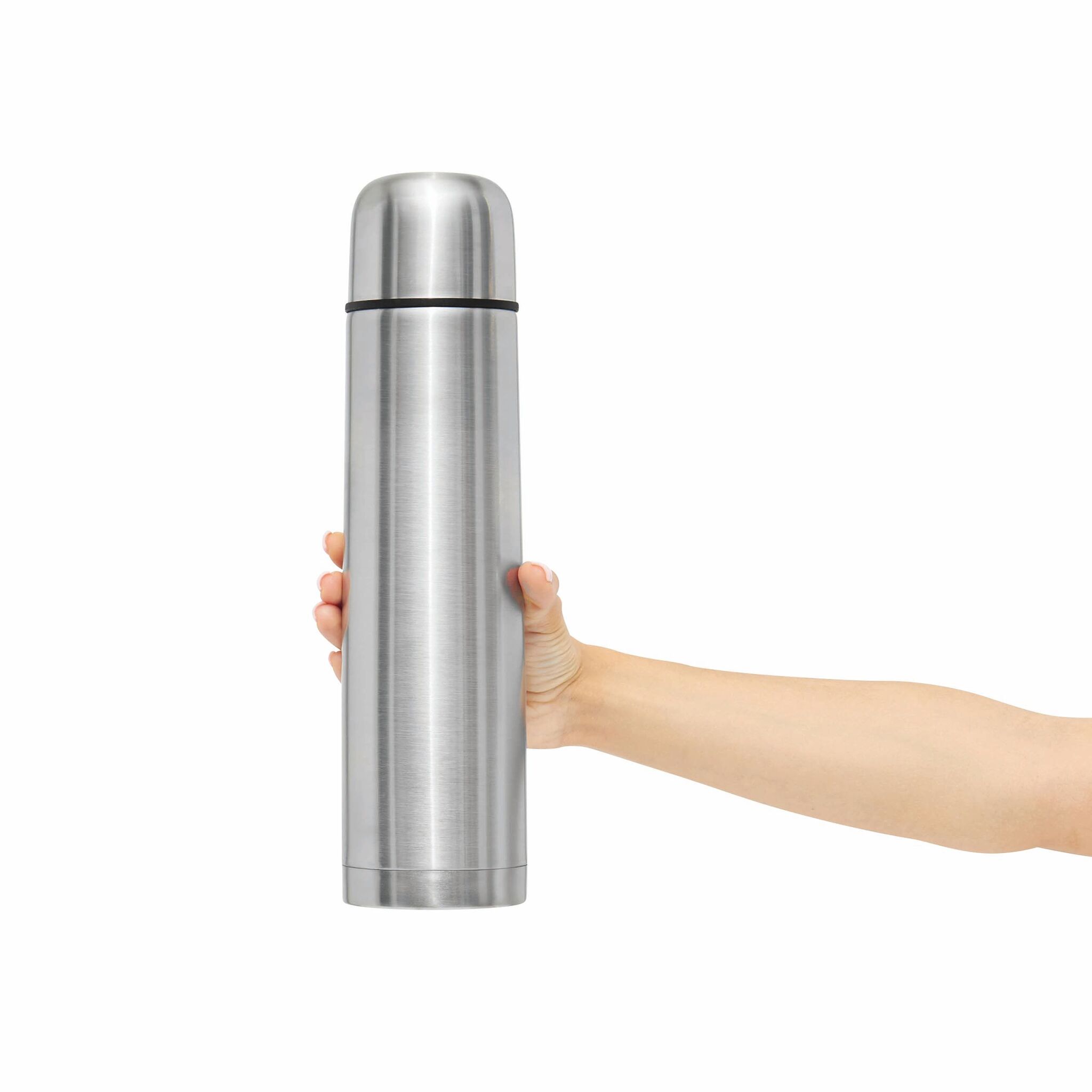 Термос с двойными стенками WARM SOUL L внутри и снаружи из нержавеющей стали, крышка (внутри пластиковая), которую можно использовать в качестве стаканчика, пластиковая, откручивающаяся пробка с кнопкой, объём ок. 1 литр, упакован в коробку.