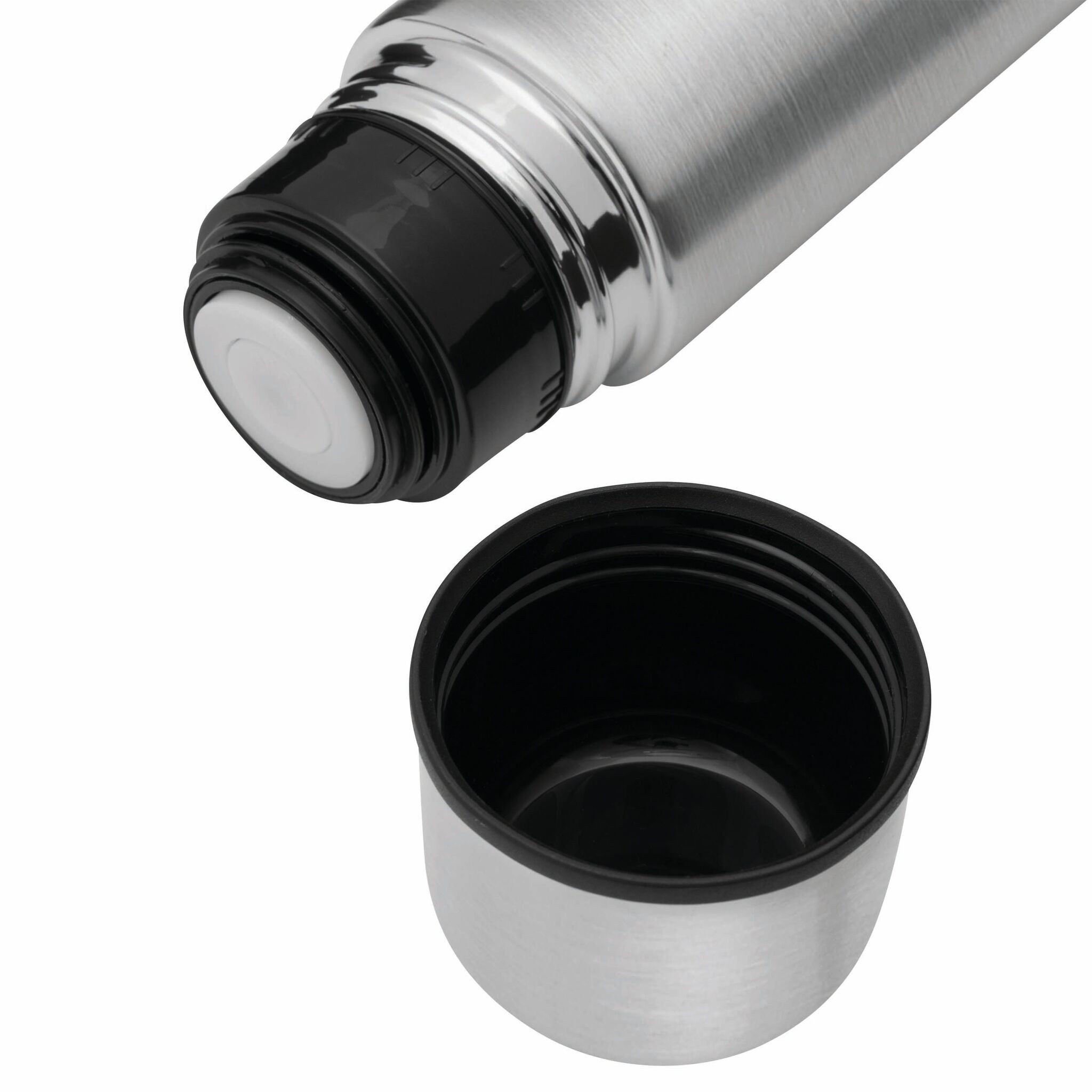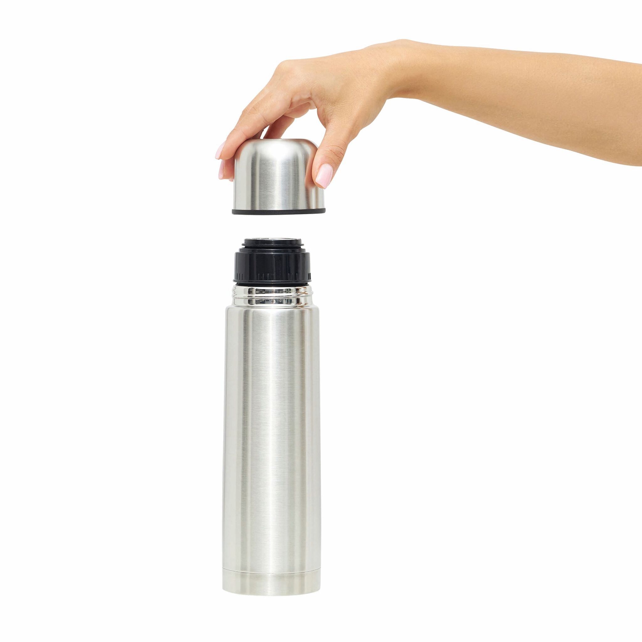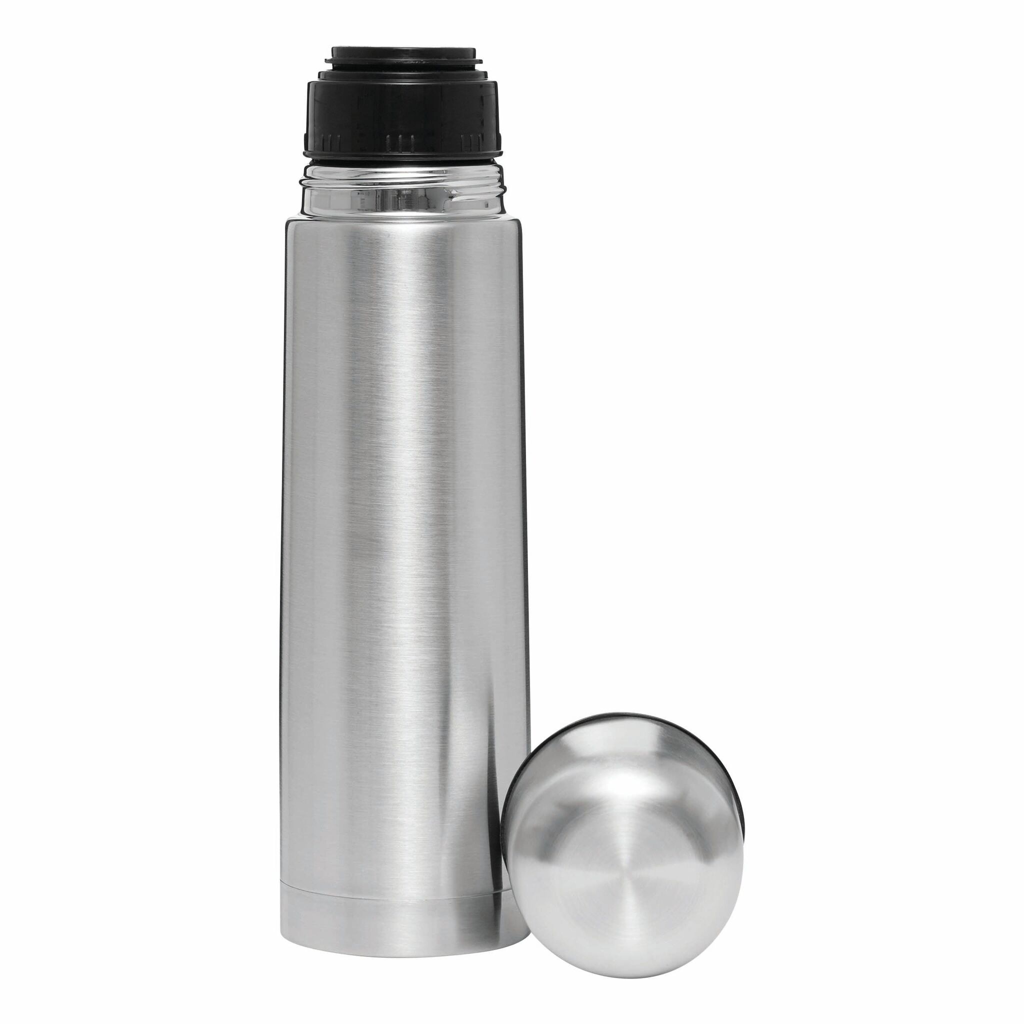Термос с двойными стенками WARM SOUL M внутри и снаружи из нержавеющей стали, крышка (внутри пластиковая), которую можно использовать в качестве стаканчика, пластиковая, откручивающаяся пробка с кнопкой, объём ок. 500 мл, упакован в коробку.