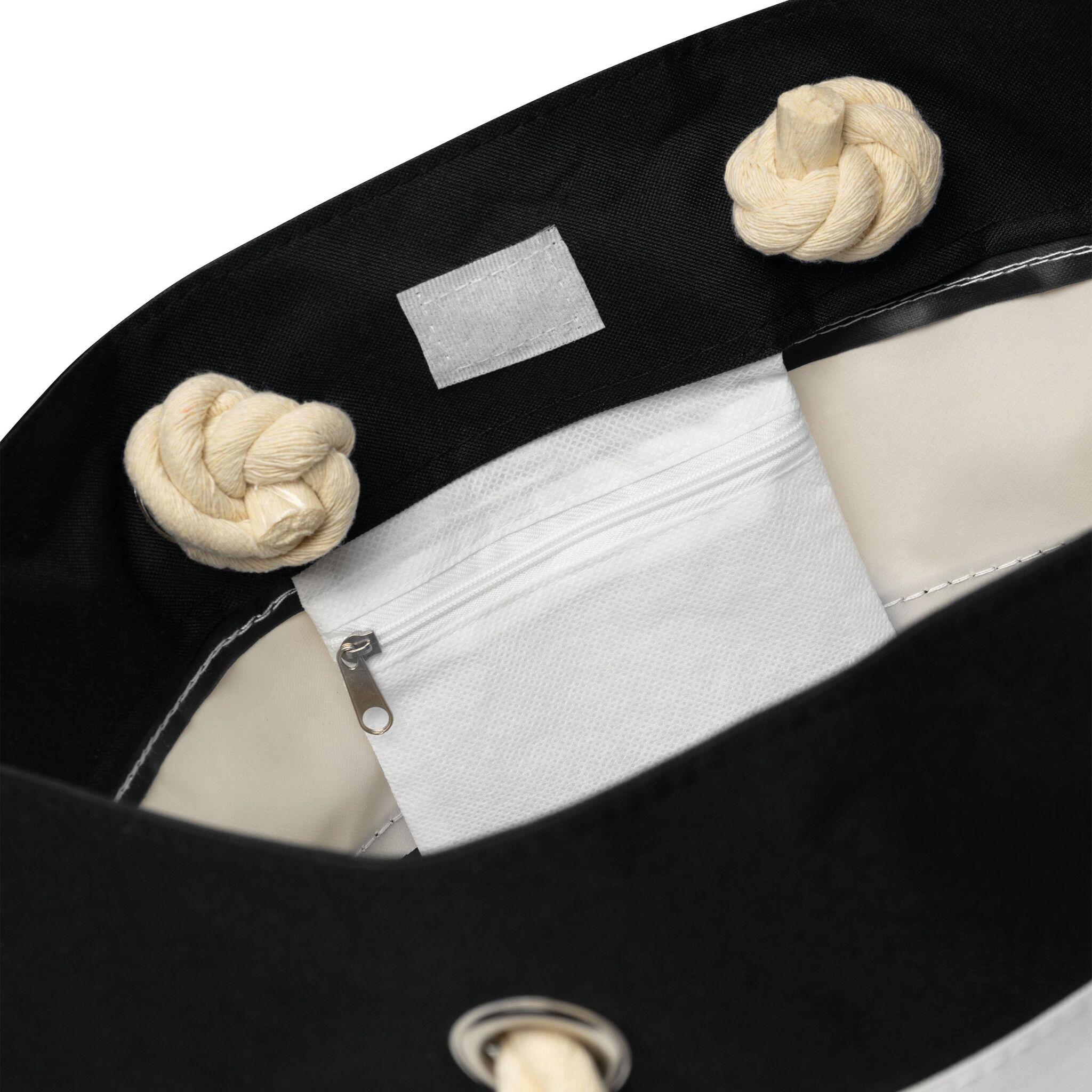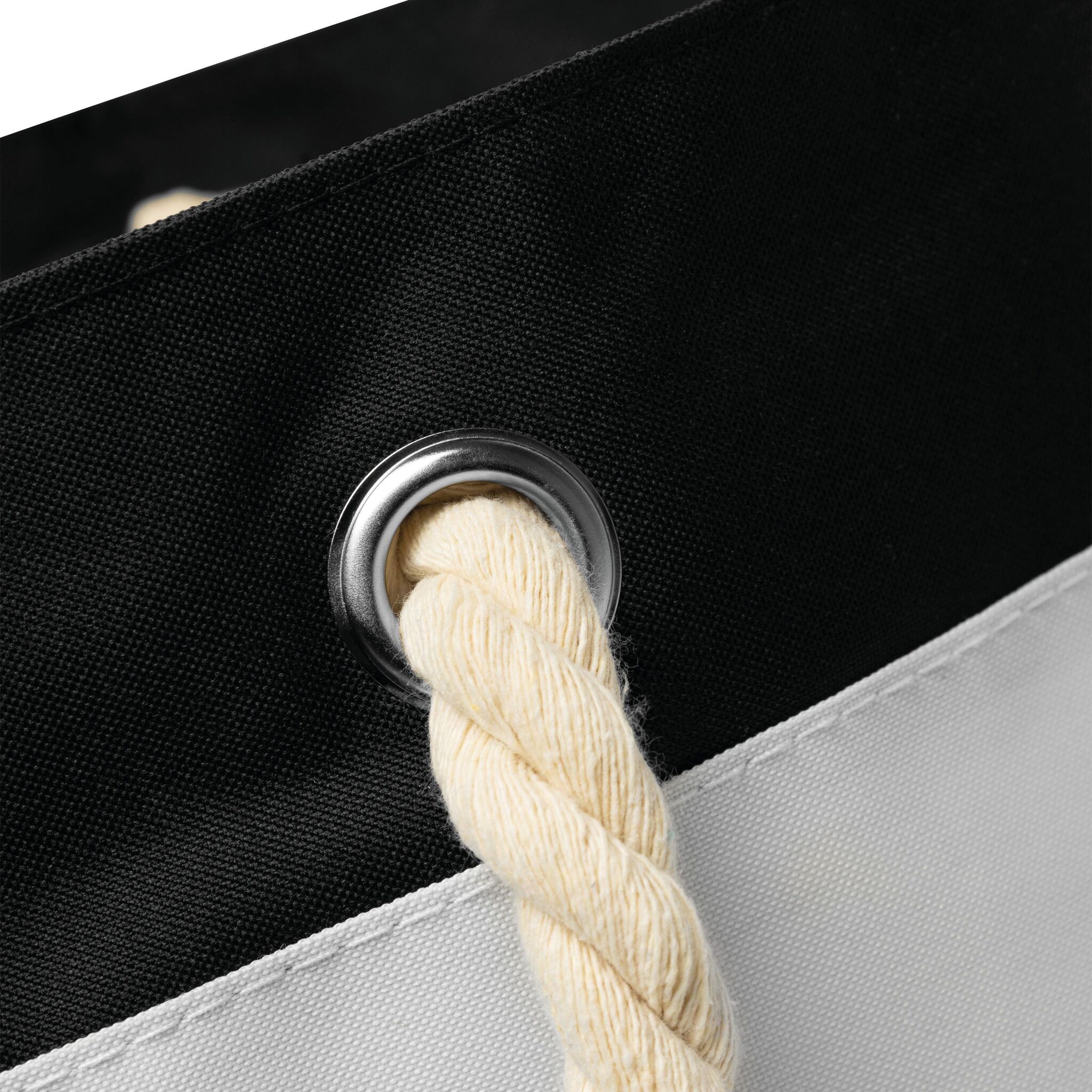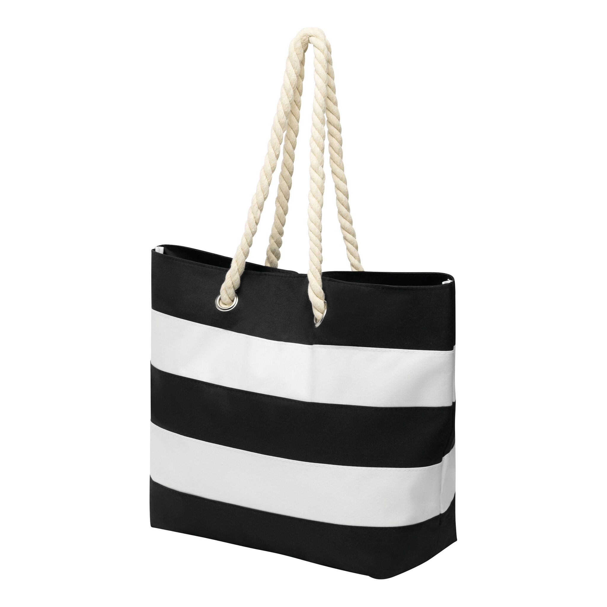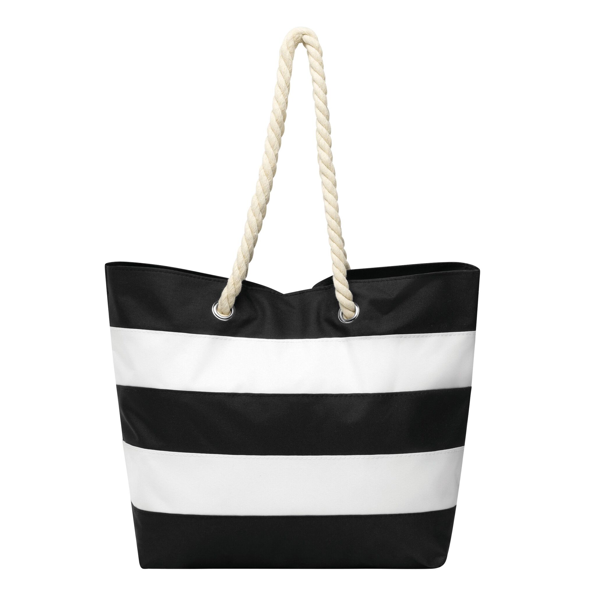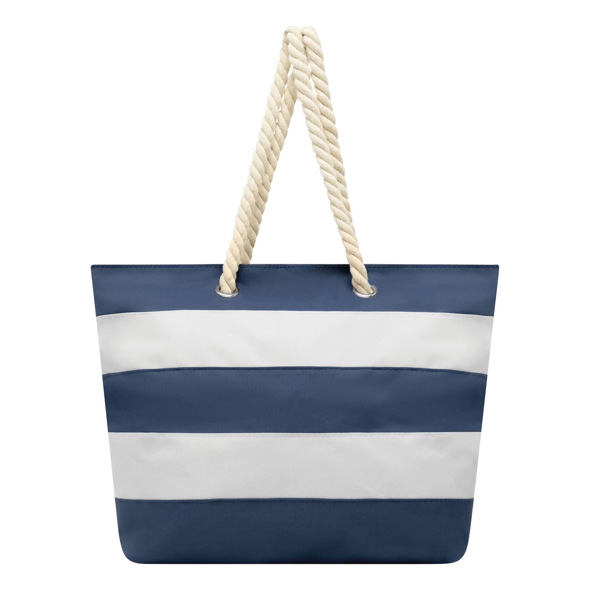 Torba plażowa SYLT w paski w marynistycznym stylu, przestronna komora główna zamykana na rzep, wewnątrz dodatkowa kieszonka na zamek błyskawiczny, 2 sznurkowe uchwyty wykonane z bawełny z metalowymi oczkami.