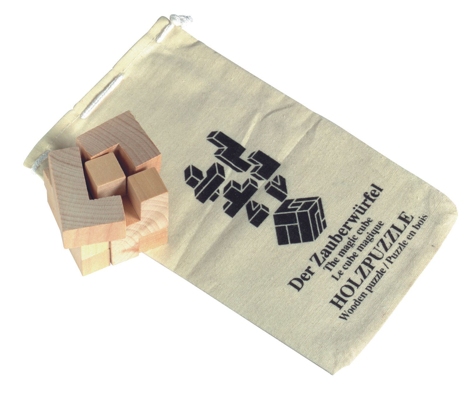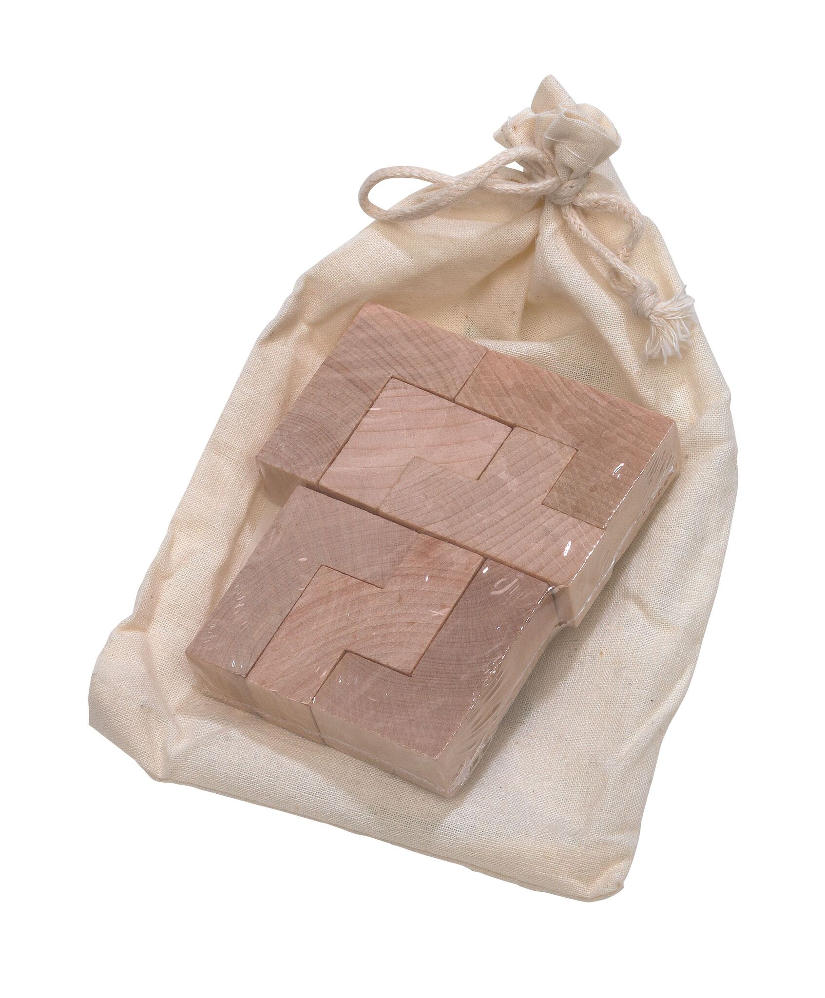 Трёхмерная деревянняа головоломка CRAZY CUBE запакована в хлопчятобумажный мешочек.