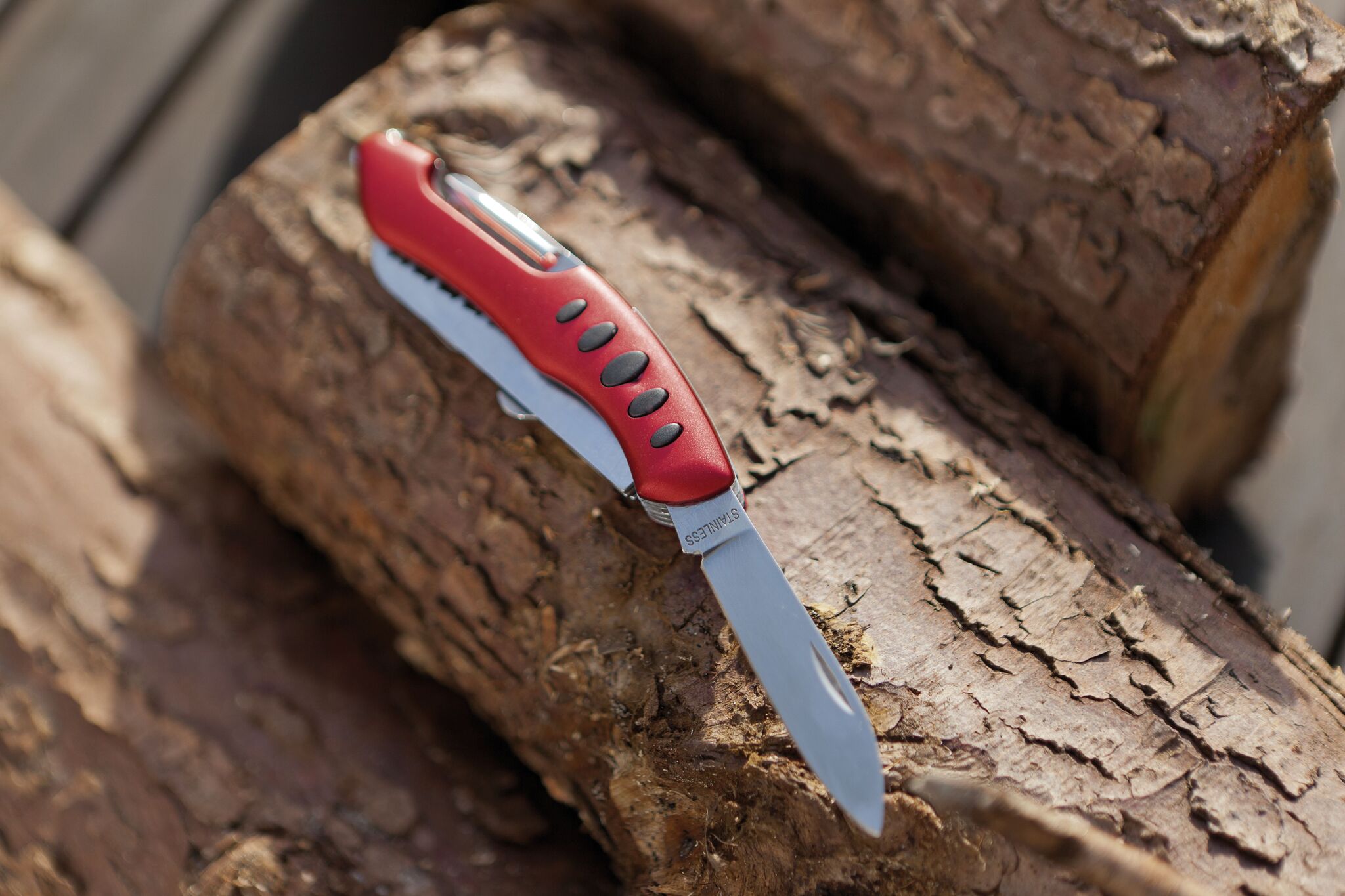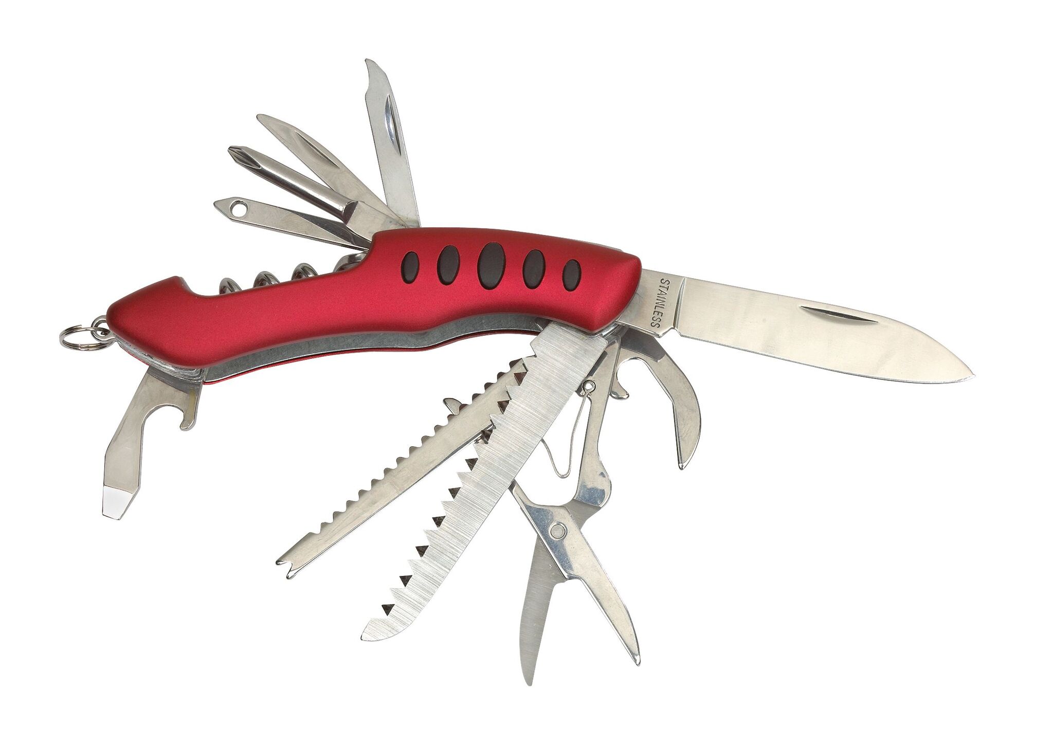 Универсальный набор инструментов BIG R. , состоящий из одиннадцати предметов: ножницы, болшая пила, маленькая пила, нож, открывалка для консервных банок, открывалка для крон-пробок, штопор, шило, натфиль, перфоратор и крестовая отвёртка, с кольцом для подвески на связке ключей, в подарочной коробке