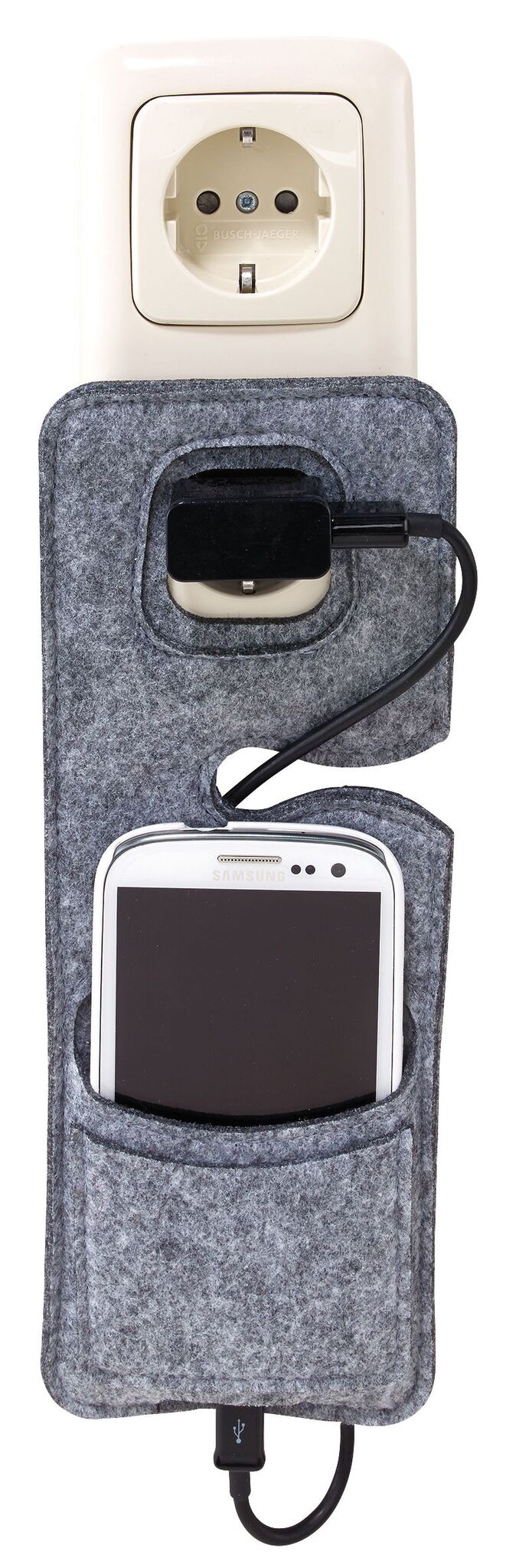 Вешалка для зарядки телефона HANGING TOUGH : Войлок – идеально подходит для зарядки вашего смартфона, iPhone® или цифровой камеры – карман на телефон и небольшой карман для батарей или аксессуаров, подключить зарядный кабель можно вставив в отверстие в верхней части – зарядная станция для аккуратного и безопасного хранения устройства вместе с кабелем во время зарядки.