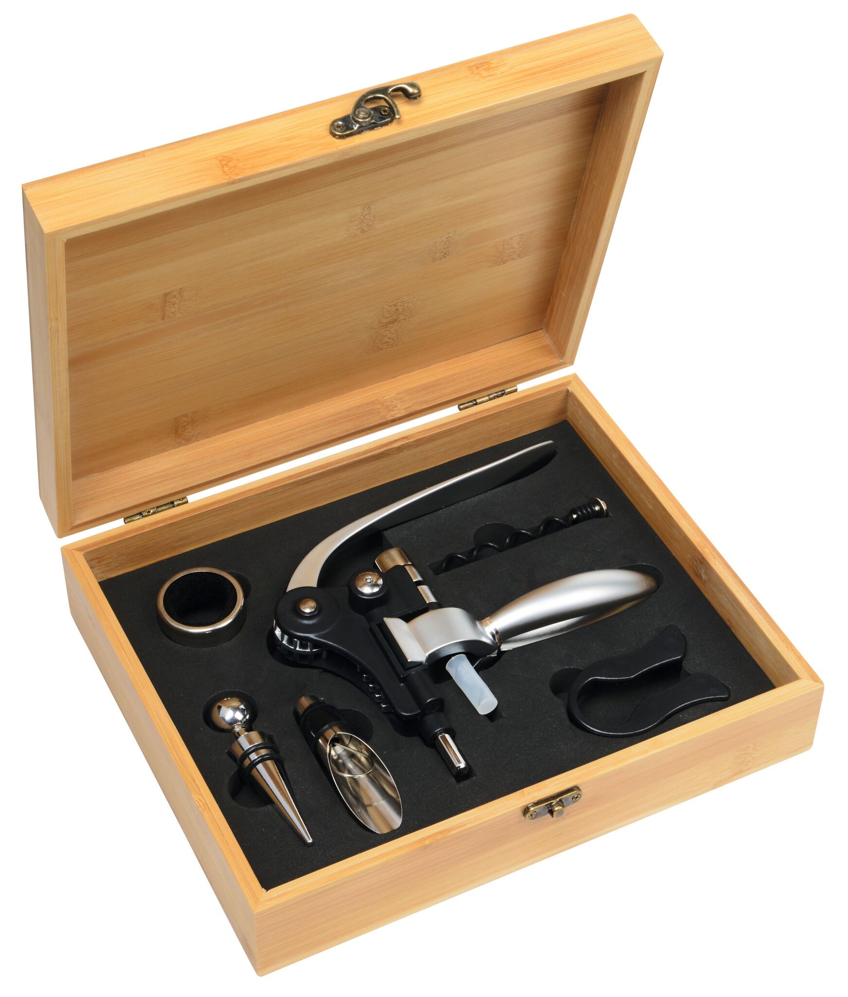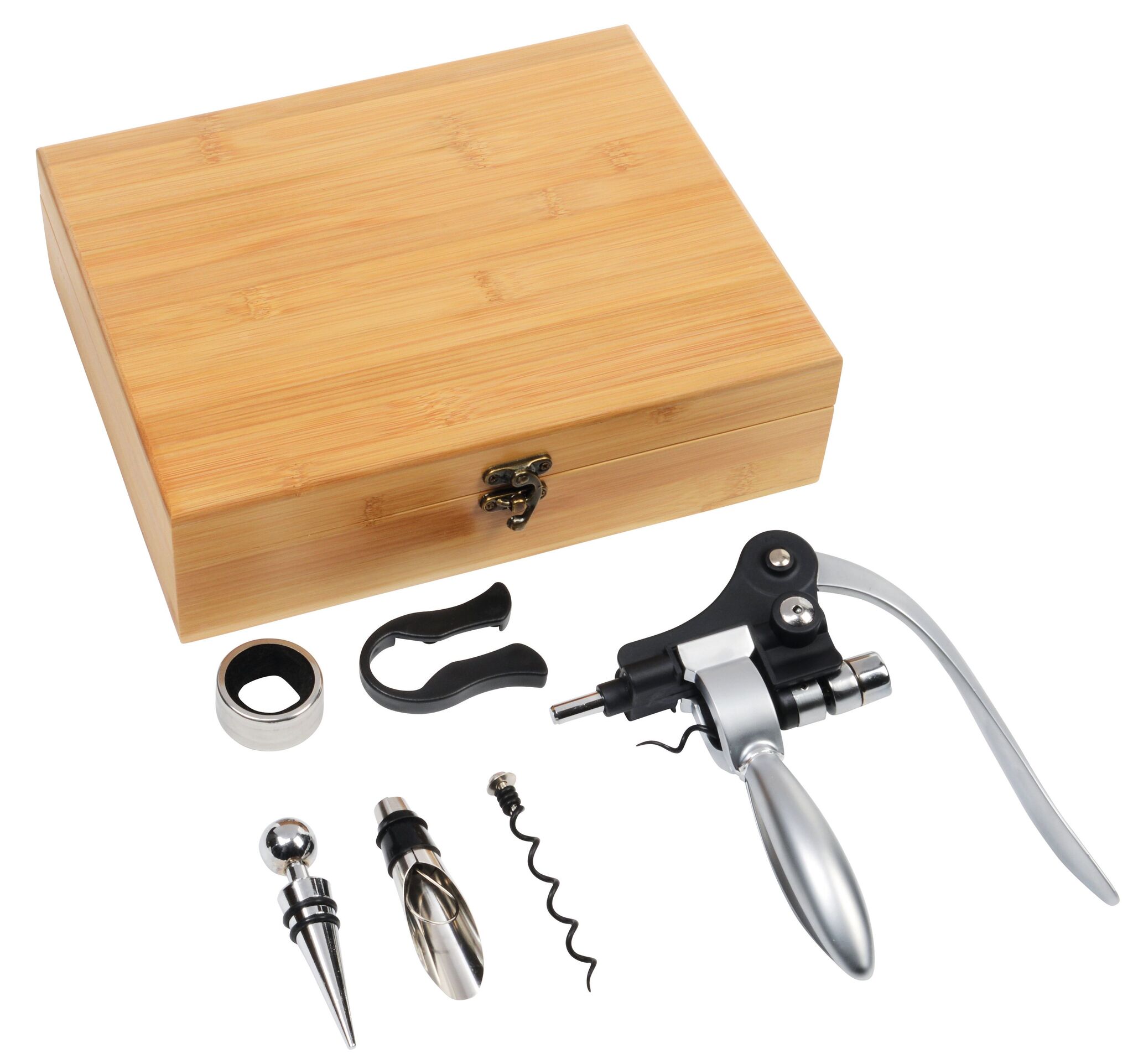Винный набор NOBLE WINE , набор сомелье в бамбуковой коробке: рычажный штопор, запасная спираль из углеродистой стали, кольцо сомелье из нержавеющей стали, металлическая пробка, металлический каплеуловитель и нож для фольги.